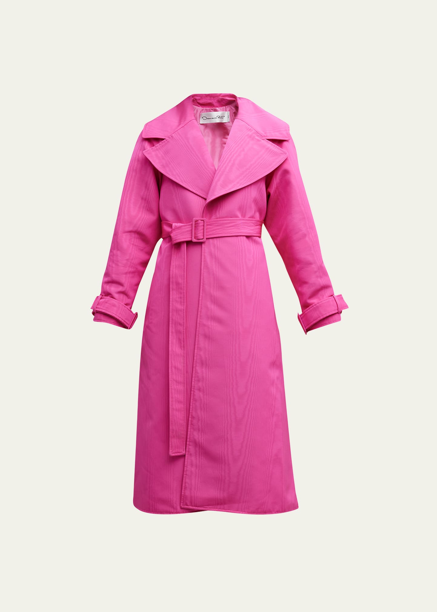 Oscar de la Renta "Moire Faille" trench coat features a tulle backing Oversize notched collar Long sleeves; belted cuffs Adjustable belted waist Back vent Cotton/viscose/nylon Lining: Silk Made in Italy