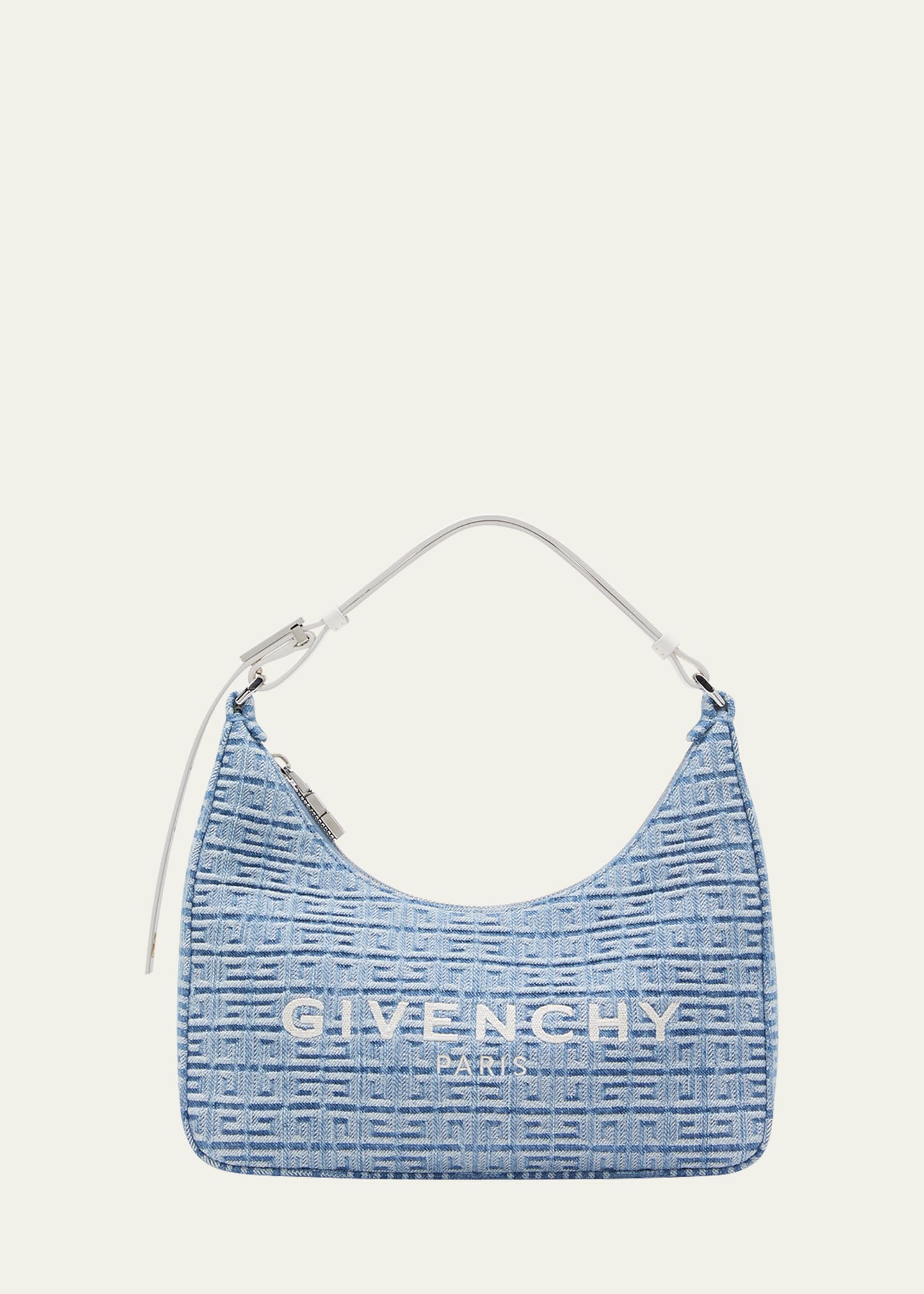 Givenchy "Moon Cut" shoulder bag in embossed 4G pattern cotton Features embroidered logo lettering across front Adjustable shoulder strap Zip top closure Lining: Polyurethane Approx. 4.7"H x 9.8"W x 2.8"D Made in Italy