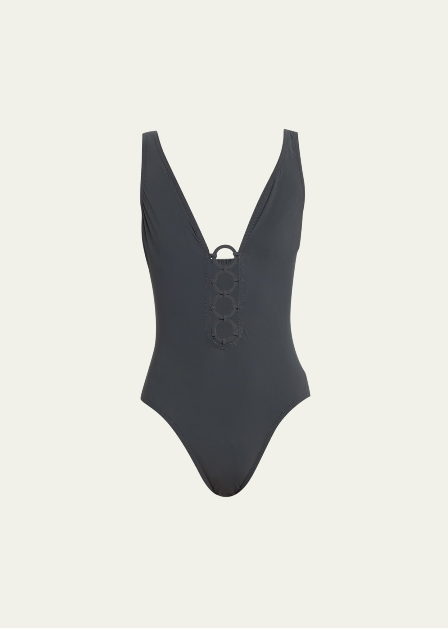 Karla Colletto "Morgan" one-piece tank swimsuit detailed with front ring accents V neckline balances figure Fixed shoulder straps Silent underwire Scoop back Full seat coverage Nylon/Lycra® spandex Made in USA