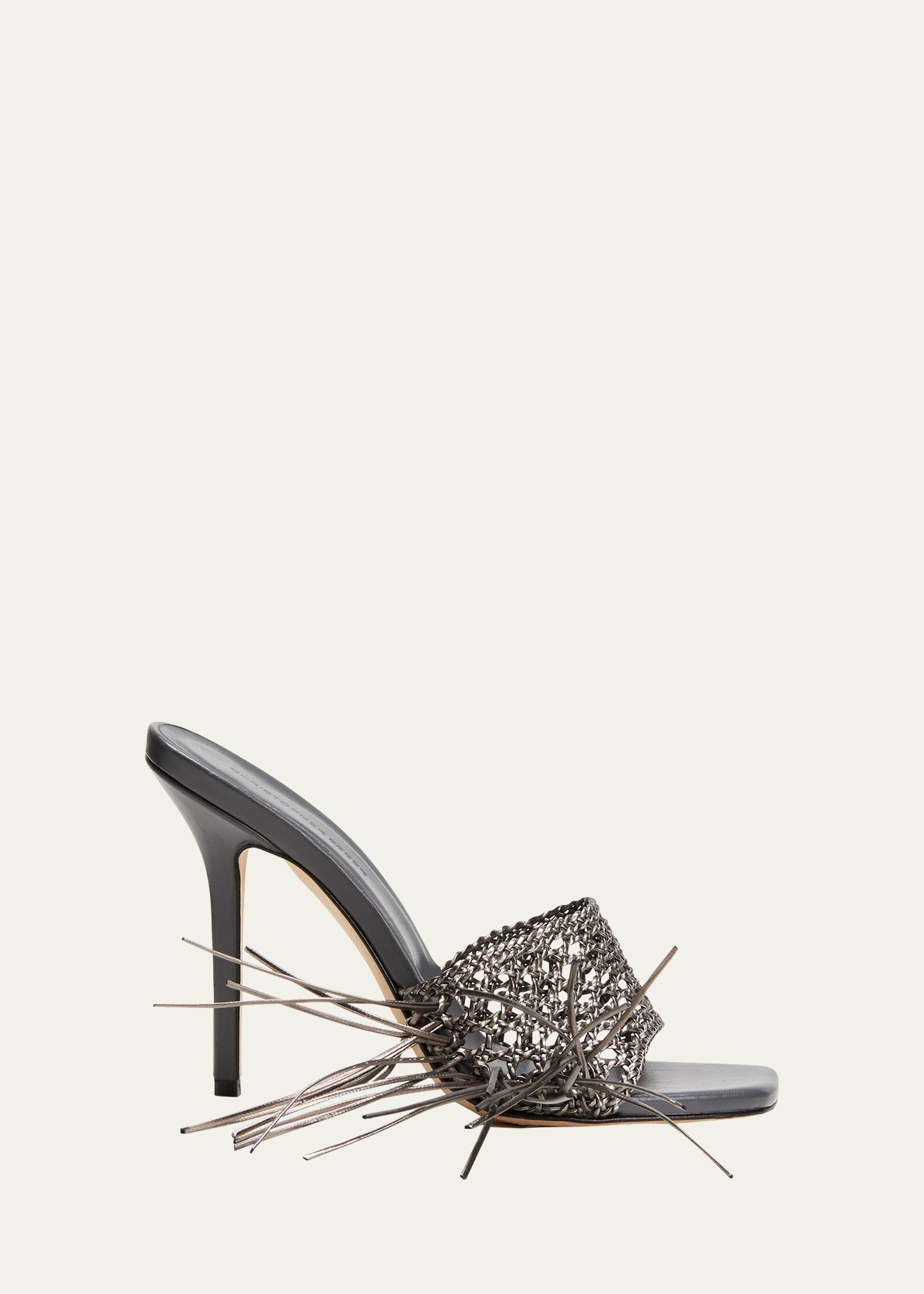Christopher Esber "Nara" leather crochet mule sandals with frayed detailing 4" / 100mm stiletto heel Open toe Single band vamp Slide style Leather sole Made in Italy