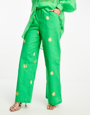 Never Fully Dressed wide leg pants in green metallic shell - part of a set