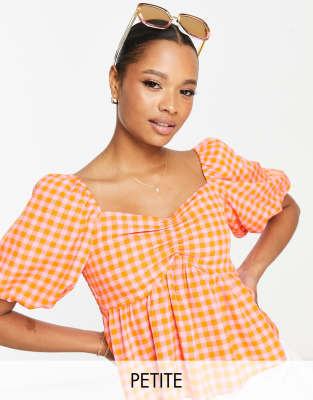 Petite blouse by New Look Love at first scroll Gingham print Sweetheart neck Puff sleeves Regular fit