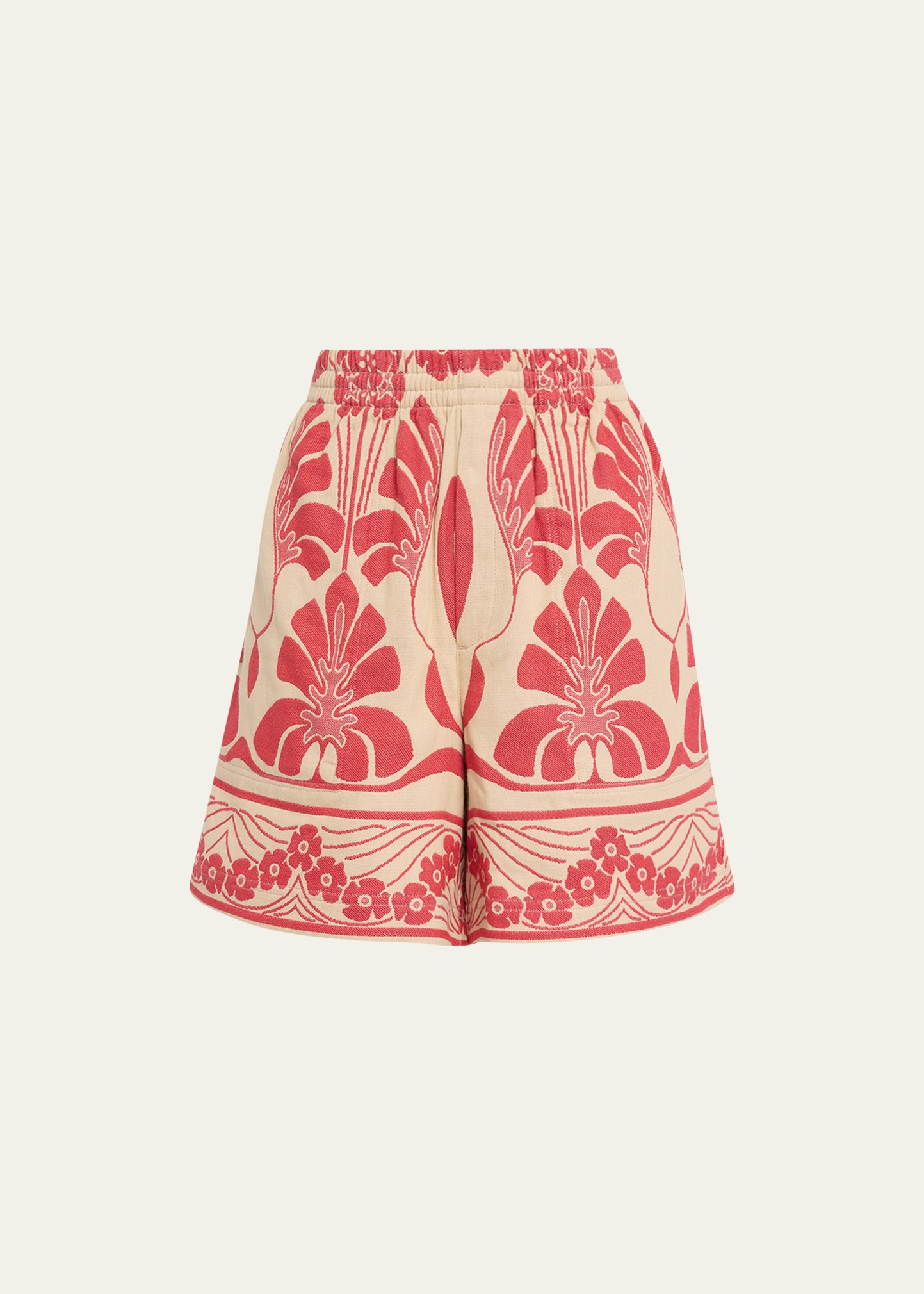 Bode "Nouveau Monstera" heavyweight jacquard shorts features monstera leaves High elastic waist Side slip pockets; back patch pocket Wide legs Mid-thigh length Pull-on style Cotton Dry clean Made in Portugal