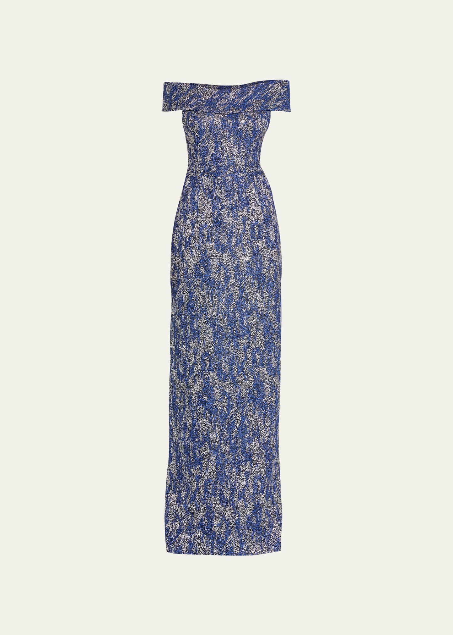Rickie Freeman for Teri Jon gown crafted from textured stretch jacquard Off-the-shoulder neckline Short sleeves Center back slit Floor-length Column silhouette Invisible back zipper Polyester/metallic/elastane Lining: Polyester Dry clean Imported