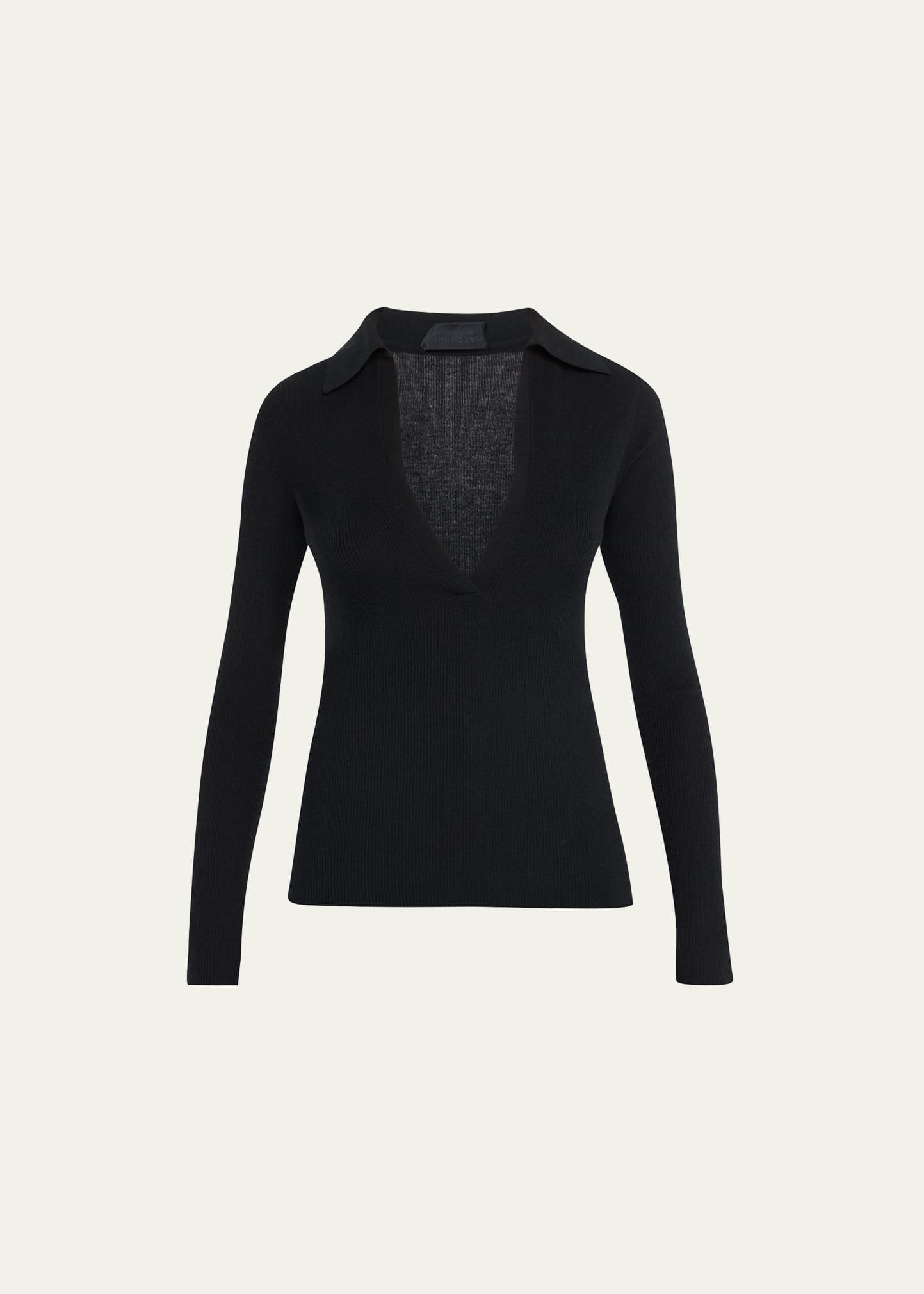 Nili Lotan "Olesya" rib-knit sweater Spread collar with V neckline Long sleeves Slim fit Pullover style Wool/cashmere Imported
