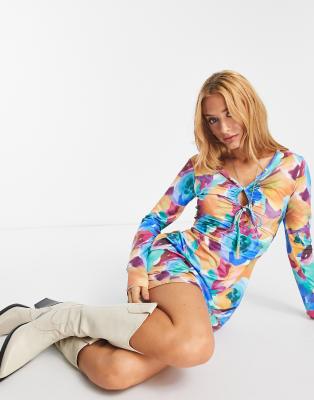 Dresses by Only All other dresses can go home Floral design V-neck Long sleeves Ruched and cut-out front Regular fit