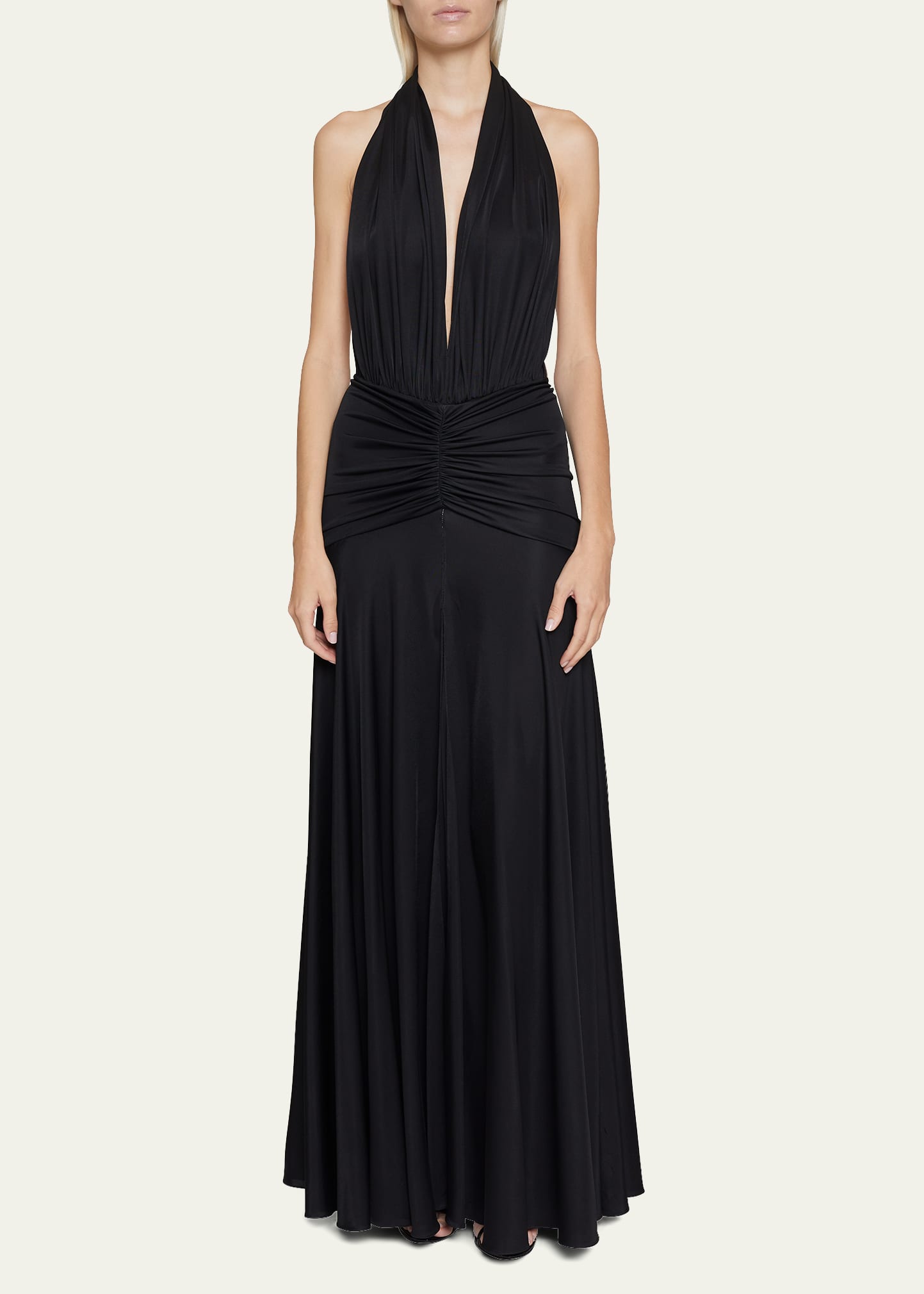 ALAIA ruched halter gown with an open-back styling Deep v-neckline Sleeveless Concealed back zip Floor length Trumpet silhouette Viscose/polyamide Made in Italy