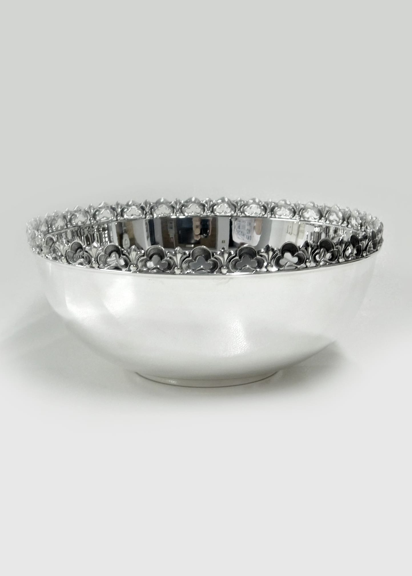 Bowl is made of sterling silver. Features detailed rim. Made in Italy.