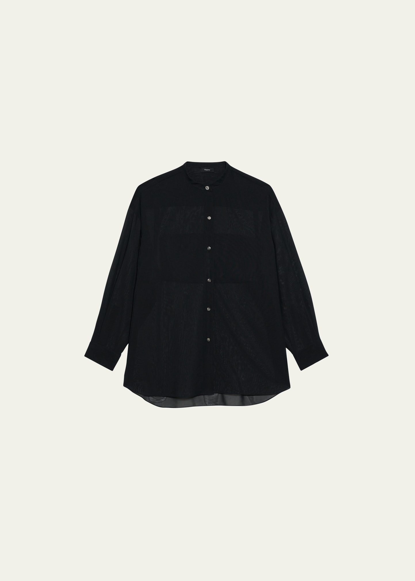 Theory sheer cotton voile shirt with a combo bandeau top for layering Band collar; button front Long sleeves; button cuffs Dropped shoulders Oversized fit Hits below the hips Cotton/polyester Imported
