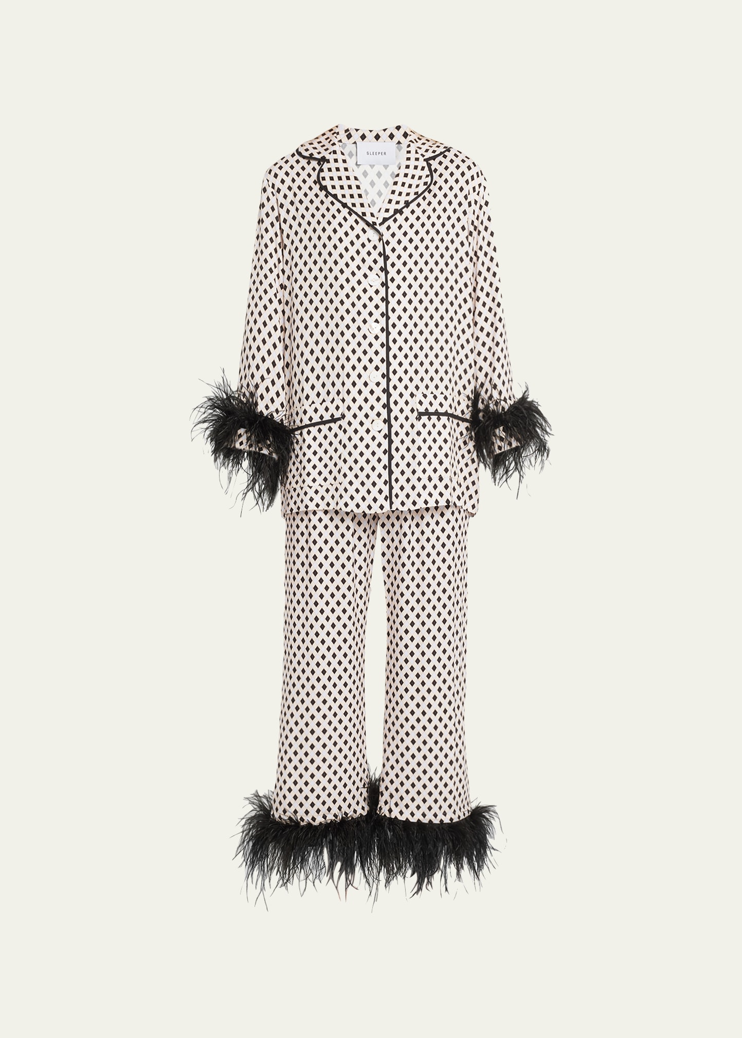 Sleeper "Party" pajama set in a diamond grid print features detachable ostrich feather trim, mother-of-pearl buttons, and contrast piping Notched collar; button front Long sleeves Drop shoulders Front patch pockets Relaxed fit Includes matching pants Elasticized waistband Cropped at the ankle Straight legs Pull-on style Viscose Trim: 100% feather (ostrich) Imported