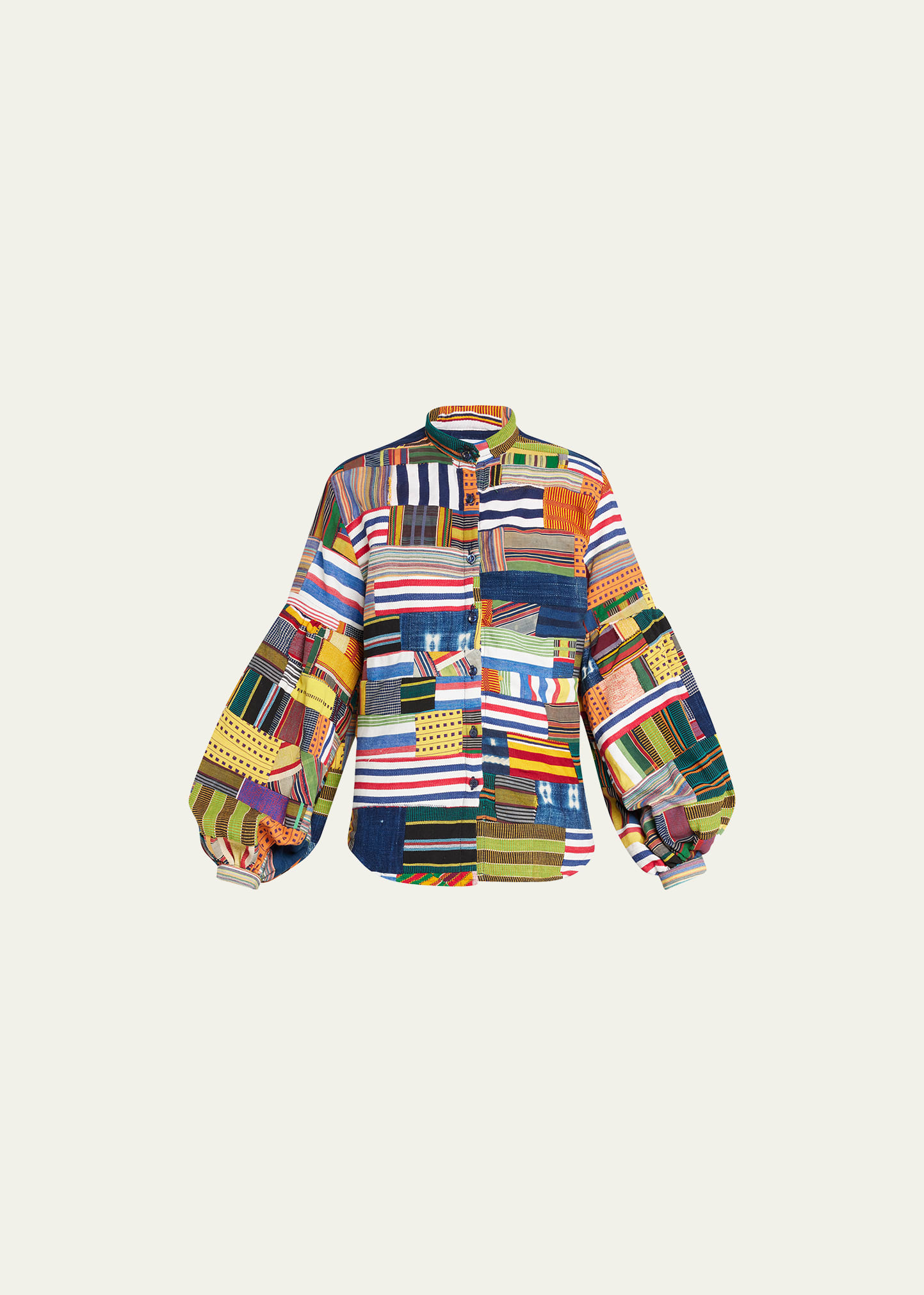 Studio 189 shirt patchworked from various cotton offcuts Band collar; button-front placket Long blouson sleeves Relaxed fit Shirttail hem Cotton Made in Ghana