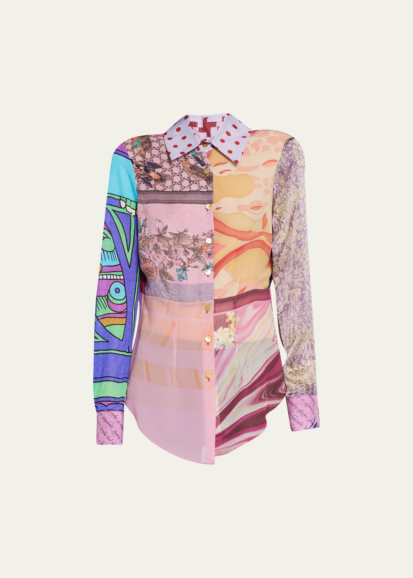 CONNER IVES shirt featuring a patchwork scarf print Point collar; button front Long sleeves; button cuffs Fitted Shirttail hem Silk/polyester Made in United Kingdom