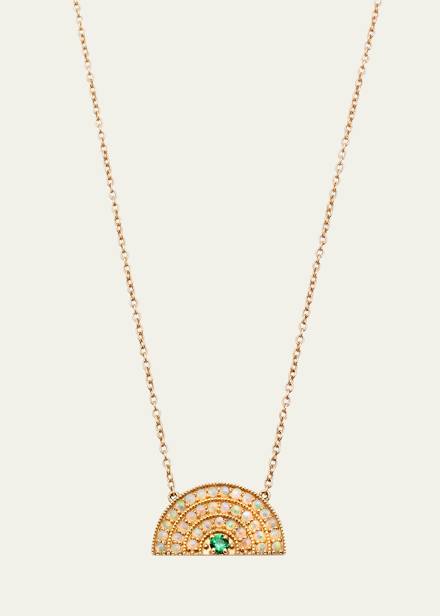 Andrea Fohrman pendant necklace Approx. 18" length with 16" option; 0.6" pendant Polished 14-karat yellow gold Three-row rainbow with opals Prong-set round-cut emerald Adjustable length Lobster clasp Wipe clean Made in USA