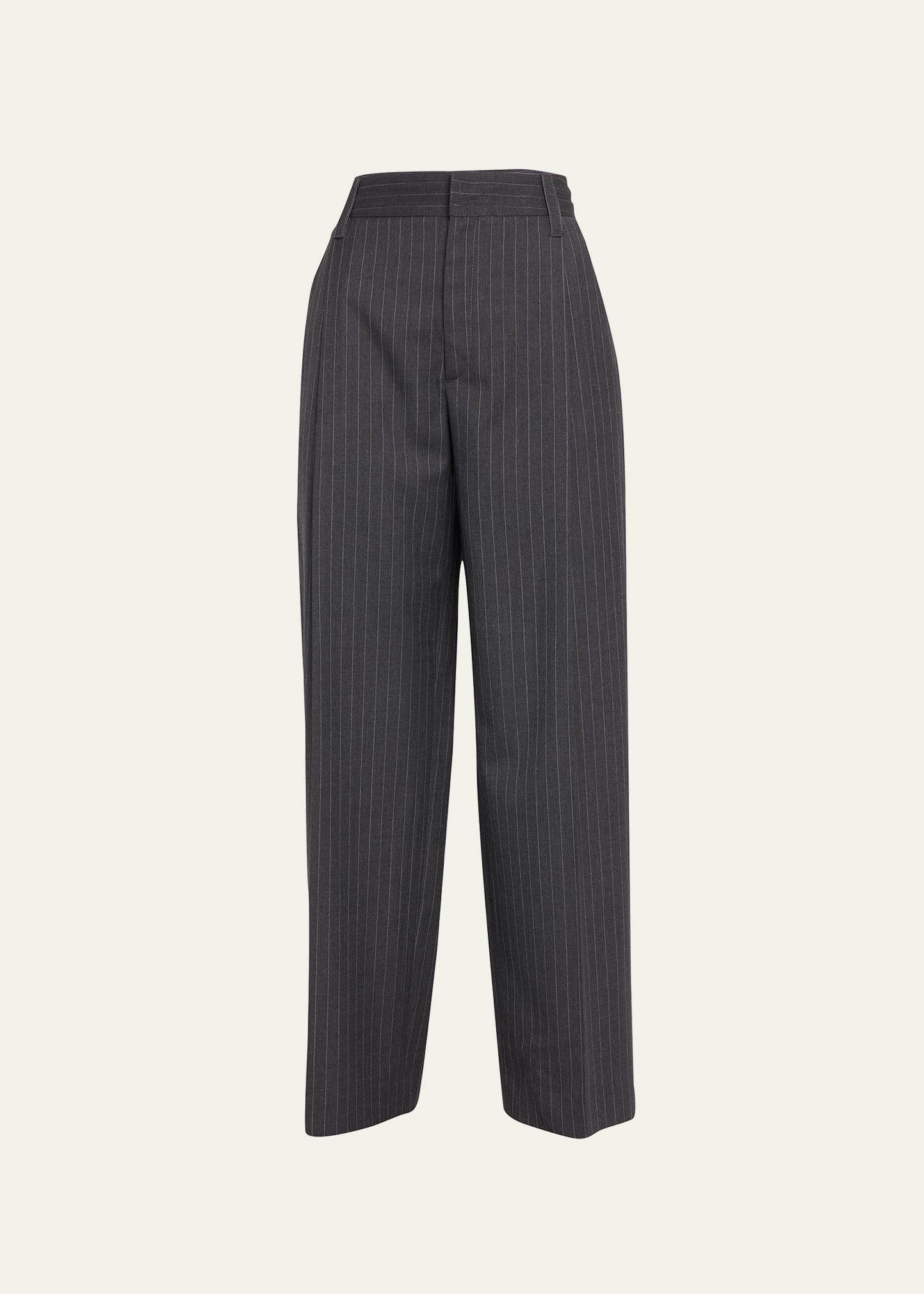 MARIA MCMANUS stretch wool trousers with pleated front in pinstripe Approx. measurements: 13.1" rise; 31" inseam Mid rise Side slip pockets; back welt pockets Straight legs Full length Tab/zip fly; belt loops Wool/elastane Made in USA from imported materials
