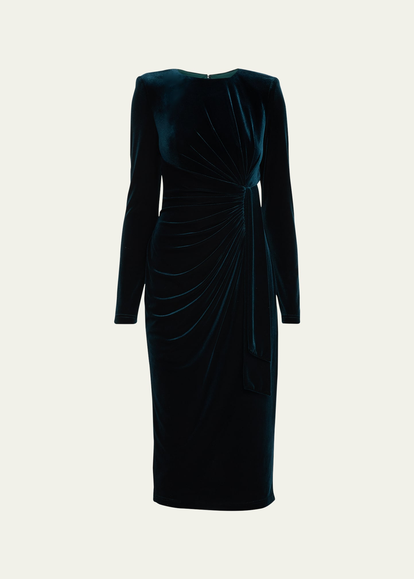 Badgley Mischka Collection pleated velvet midi dress with a gathered side drape Jewel neckline Padded shoulders Long sleeves; approx. 25.5"L Center back slit Hem falls below the knee Sheath silhouette Invisible back zipper Polyester/spandex Lining: Polyester Dry clean Imported