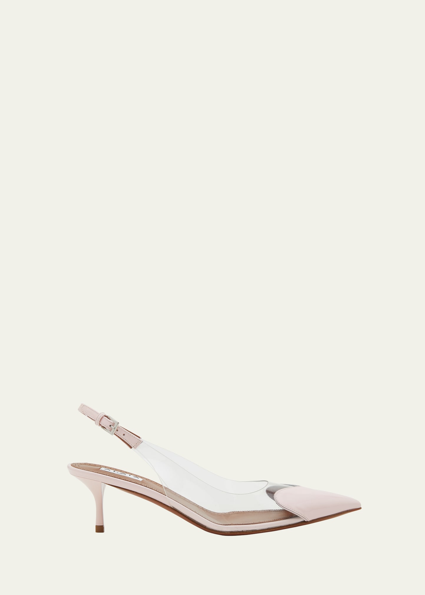 ALAIA clear plexi and patent leather pumps 2.25 in / 55 mm stiletto heel Pointed heart-cap toe Adjustable slingback strap Leather/Rubber outsole Lining: Leather Made in Italy