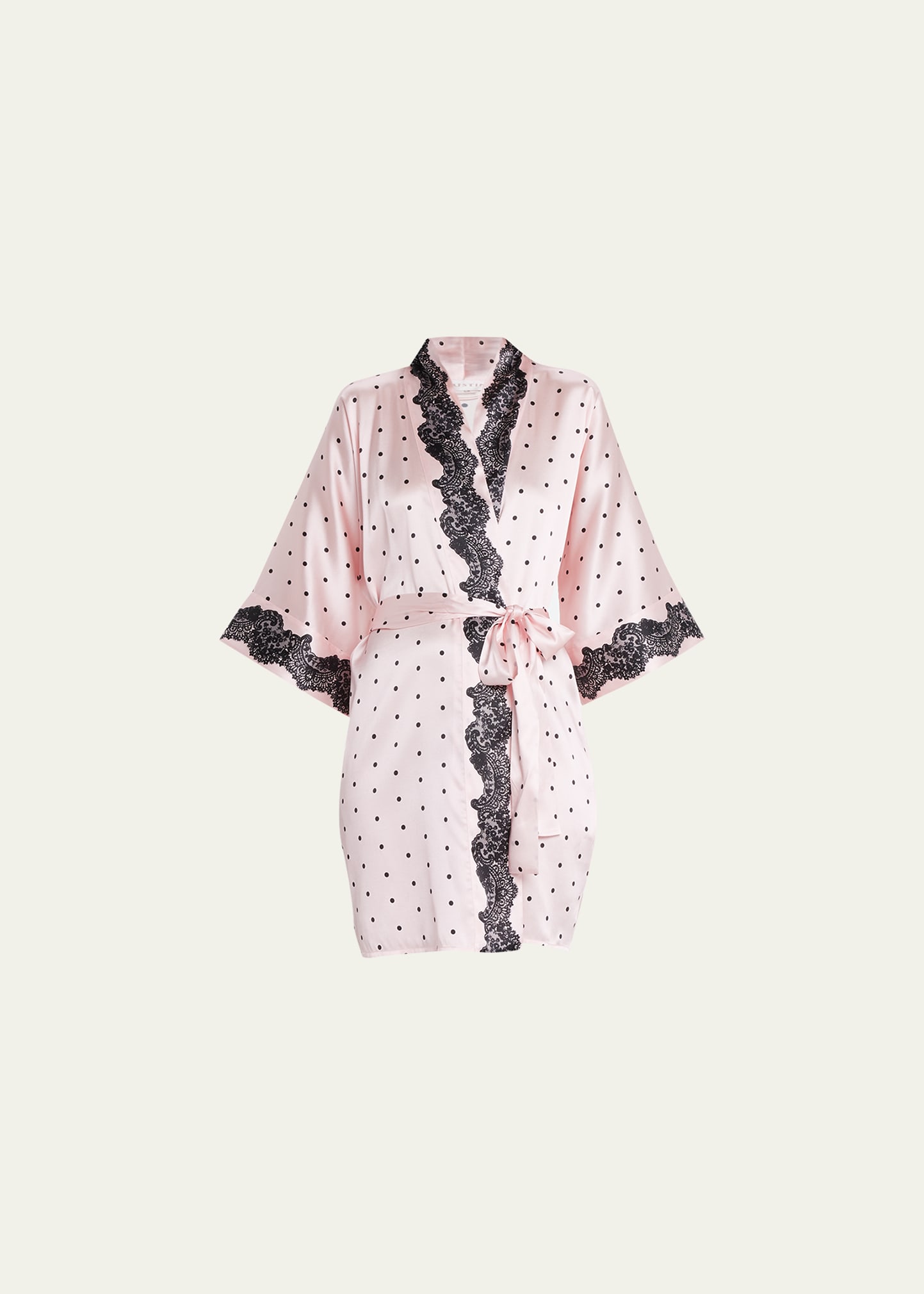Christine Lingerie polka-dot robe crafted from 16 momme stretch silk with printed lace trim Approx. 35.5"L from shoulders to hem Shawl collar; wrap front 3/4 kimono sleeves Waist self-tie Side seam pockets Mid-thigh length A-line silhouette Silk/spandex Hand wash or dry clean Made in Canada