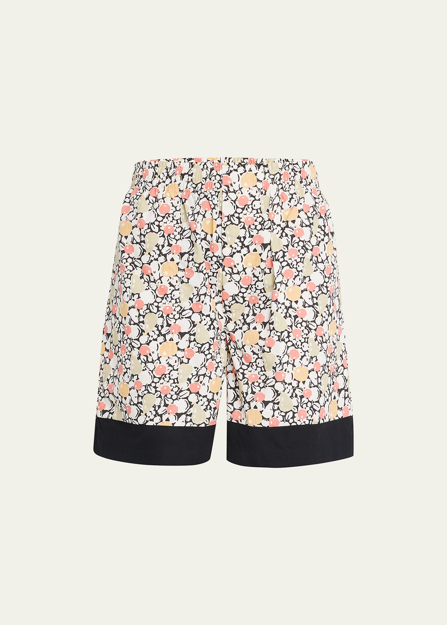 Bode shorts in pomme fruit motif with contrast trim High rise Elastic drawstring waistband Side slip pockets; back patch pocket Wide legs Mid-thigh length Pull-on style Cotton Imported