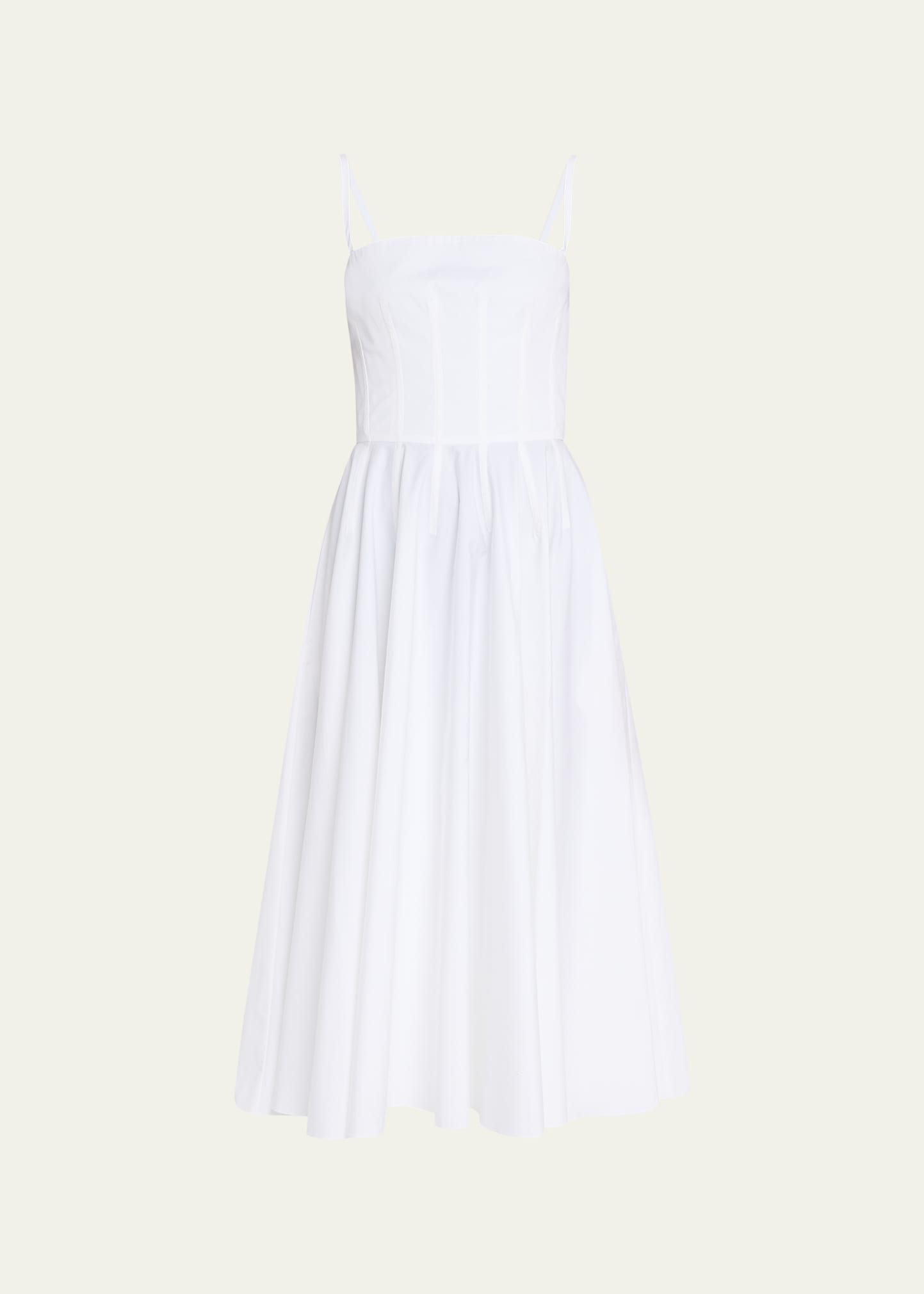 Alexander Mc Queen poplin midi dress features waist seam detailing at the bodice Square neckline Sleeveless Concealed back zip Side slip pockets Hem falls below the knee A-line silhouette Cotton Made in Italy