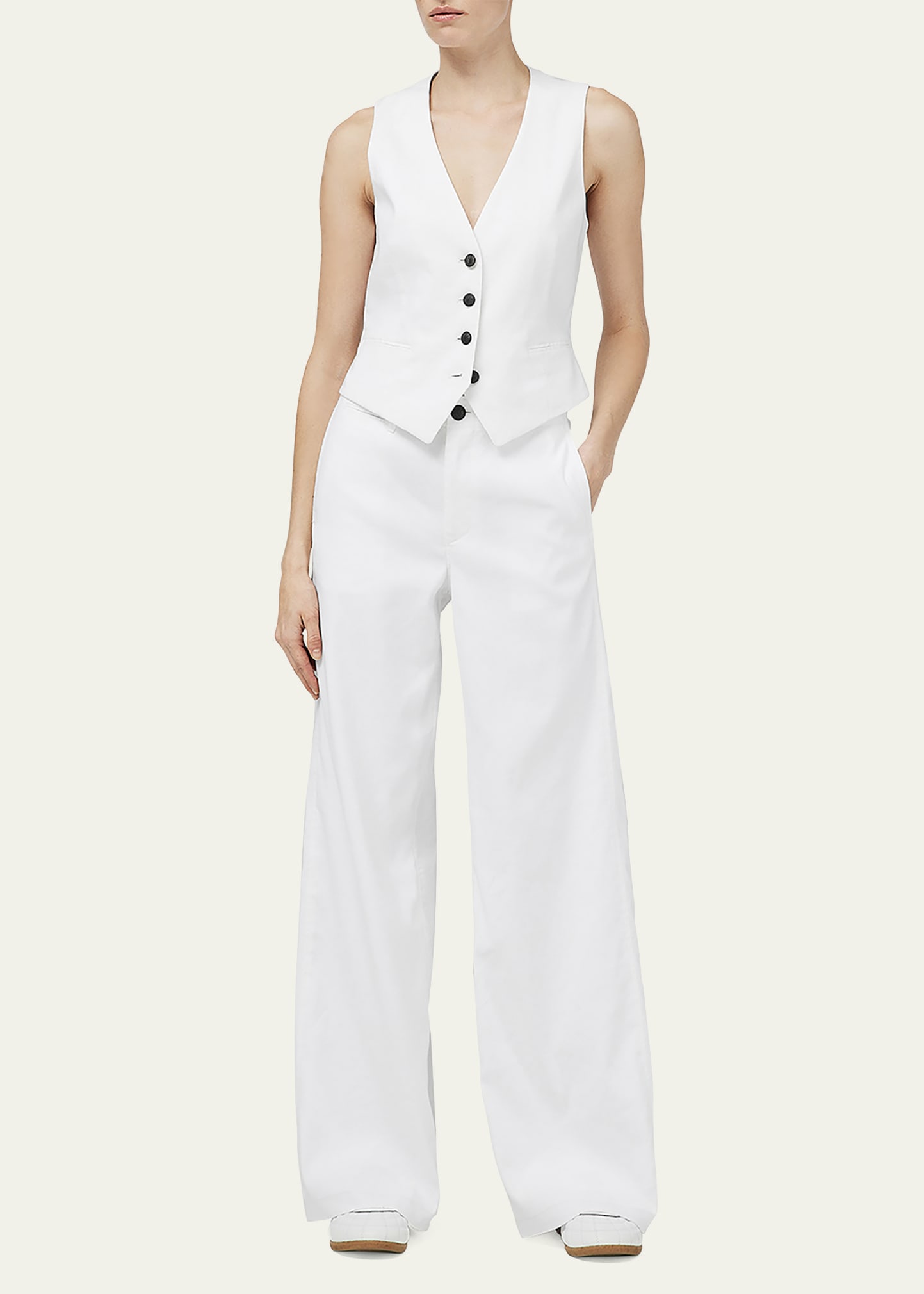 Rag & Bone "Priya" linen suiting vest featuring a buckle at back waist tab V neckline Single-breasted front Sleeveless Welt pockets Tailored fit Cutaway hem Button-front closure Linen Dry clean Imported