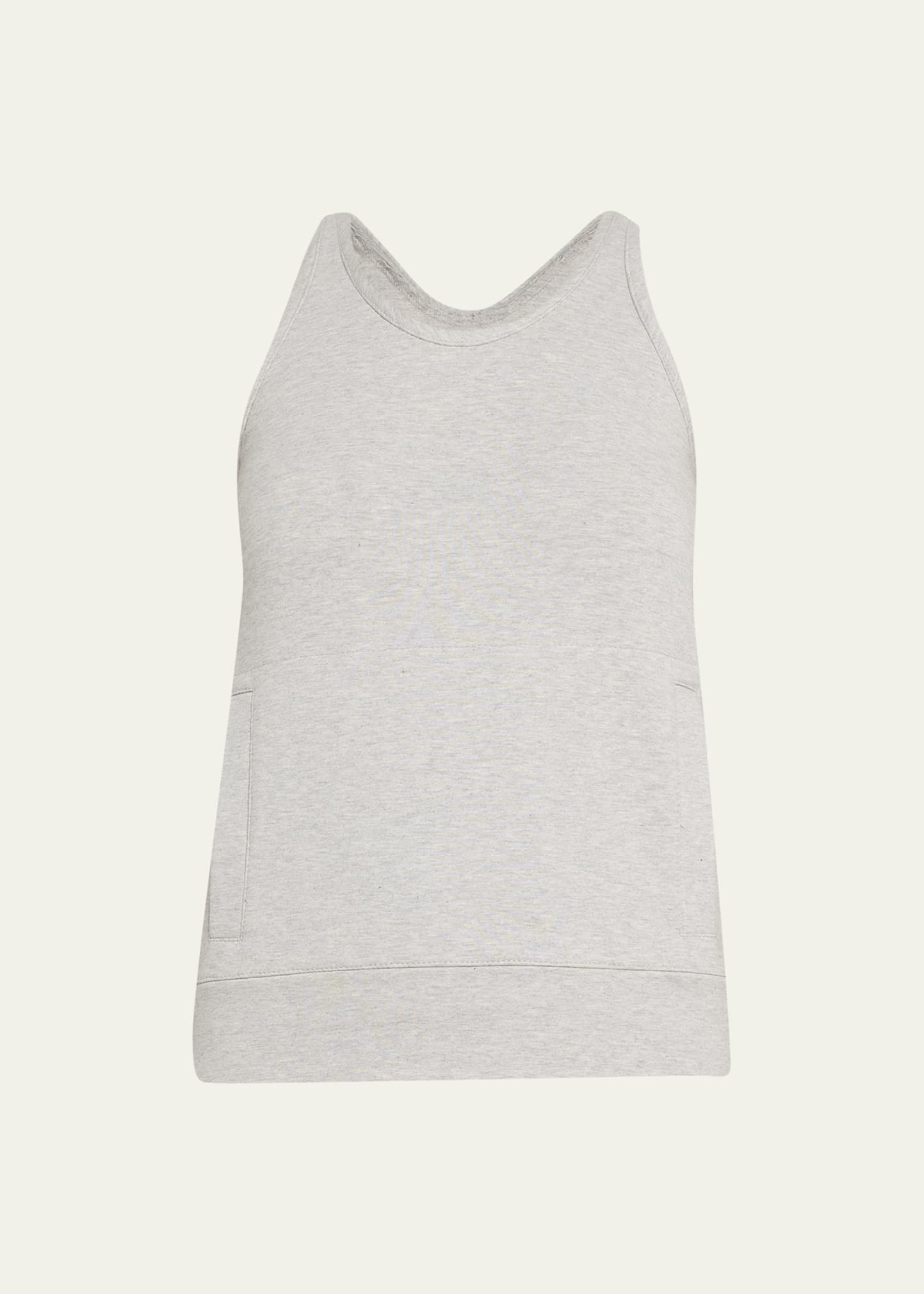 Norma Kamali tank top constructed of four-way stretch terry fabric Scoop neckline Sleeveless Racerback Kangaroo pocket Banded hem Pullover style Cotton/spandex Imported