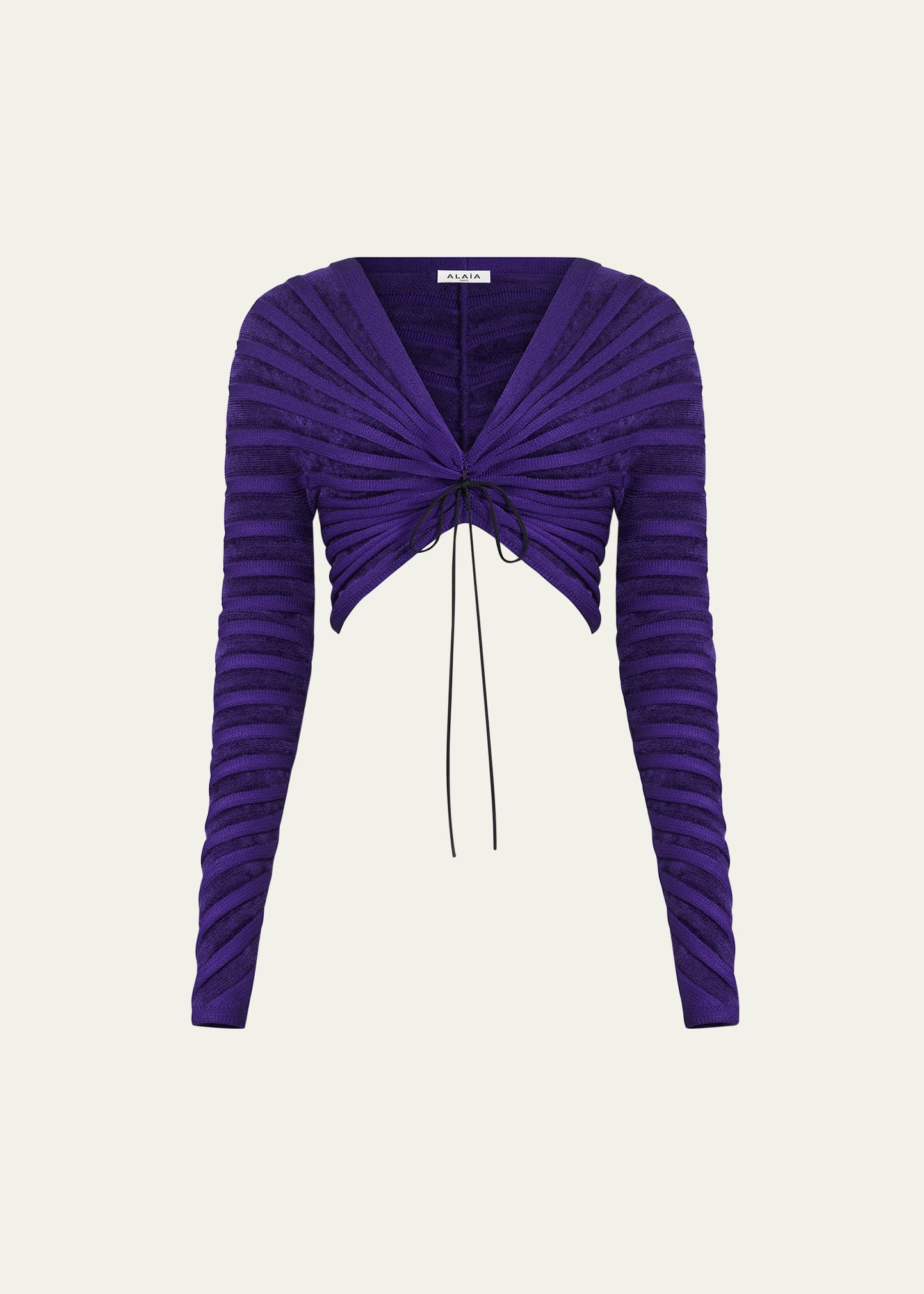 ALAIA off-shoulder ribbed top with a self-tie cinched front detail Long sleeves Cropped hem Semi-fitted Viscose/polyamide/viscose Made in Italy