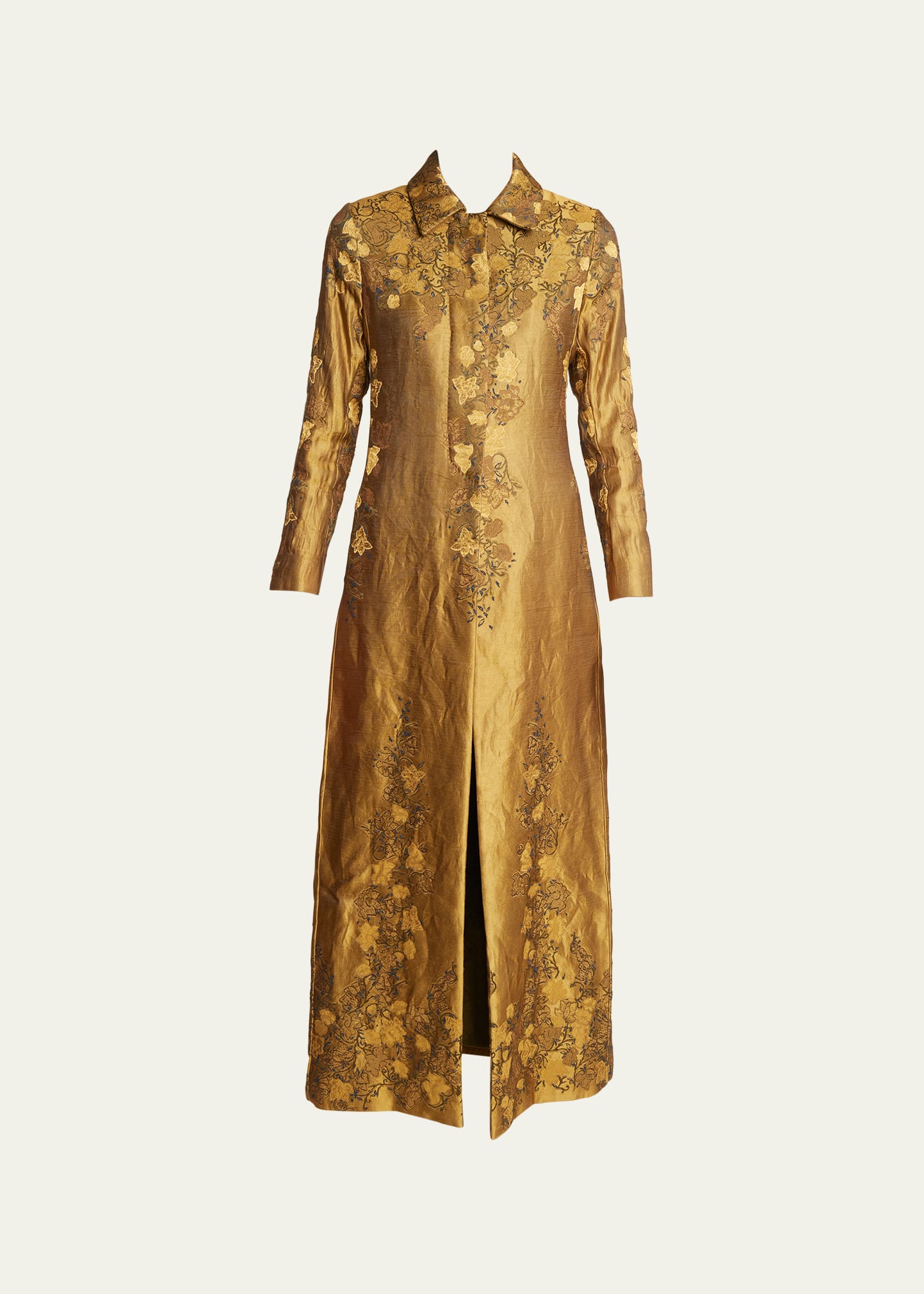 Dries Van Noten "Rilkes" jacquard coat Spread collar; covered placket Bracelet sleeves Side seam pockets A-line silhouette Long length Vented front Polyester/viscose/silk Cotton lining Dry clean Made in Poland