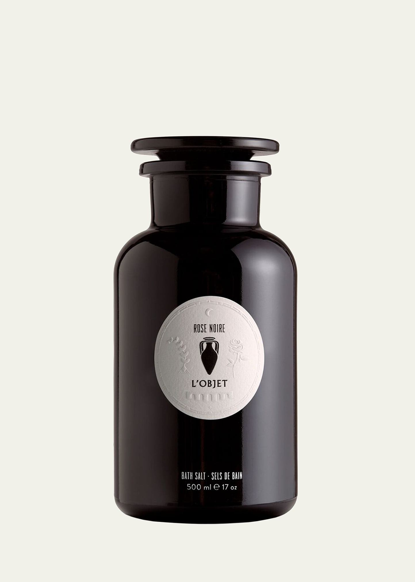 Bath salt in glass bottle. Fragrance: Rose Noire. Top: Pimento berry, white pepper. Heart: Rose, tea. Base: Moss. 500 mL / 17 ounces. Made in Portugal.