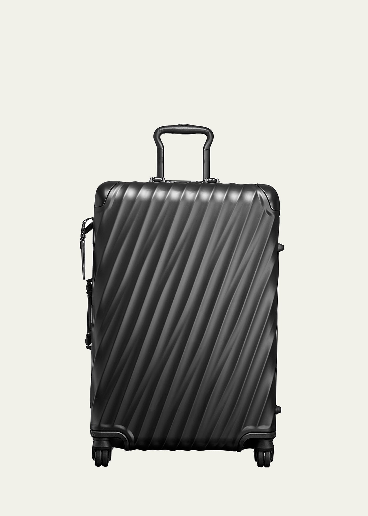 Hard-sided aluminum packing case. Exterior features zip entry to main compartment, integrated TSA lock with replaceable pullers, three-stage telescoping handle system with push button, retractable top and side carry handle, and four dual-spinning recessed wheels. Interior features three zip pockets, tie-down straps, and hanger bracket. 18"W x 10"D x 26"T. Imported.
