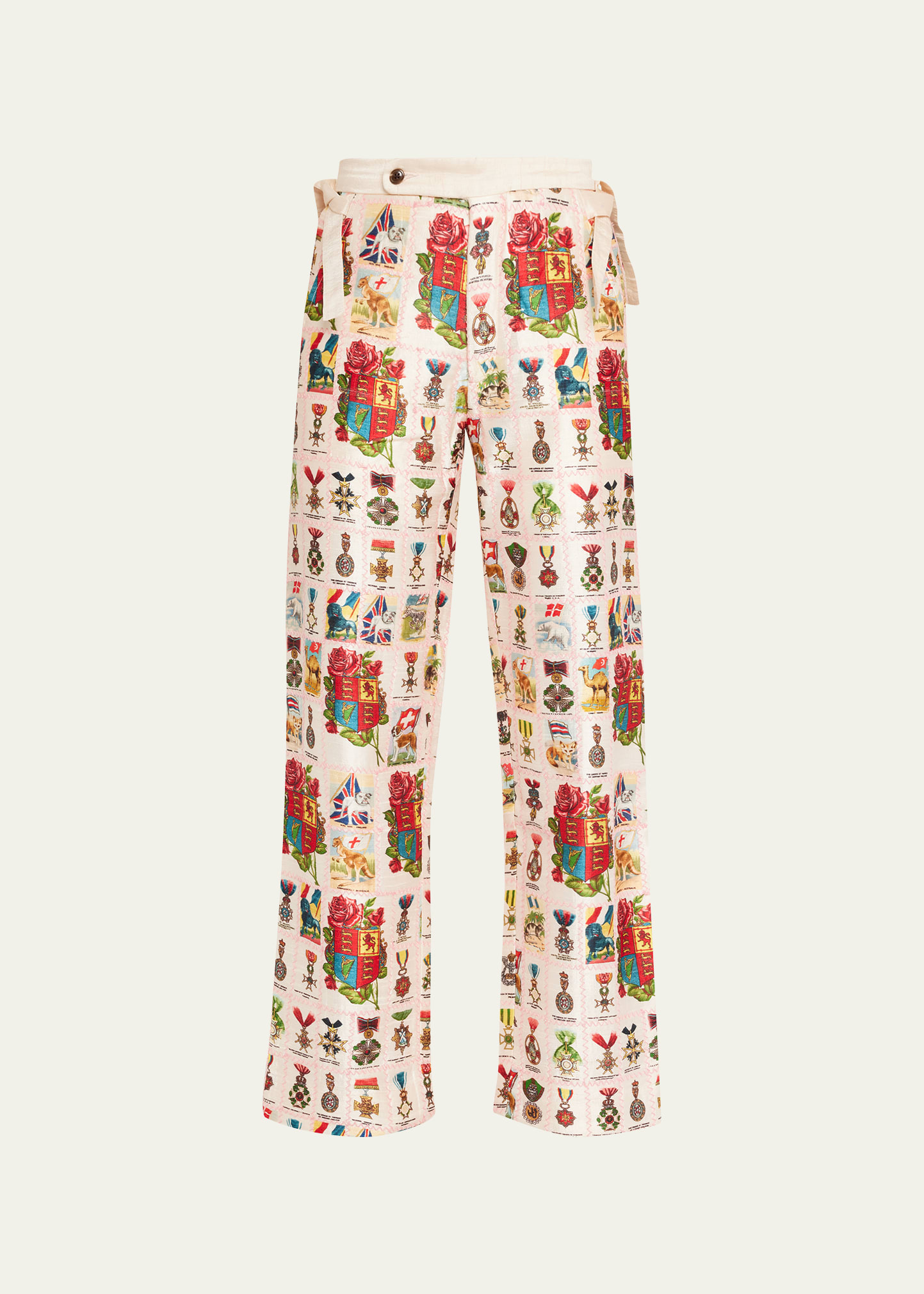 Bode tobacco trousers in an all-over signet quilted styling Flat front High rise Button/zip fly; elongated front tab Side tie waist adjusters Side slip pockets; back flap pockets Straight legs Cropped at the ankle Relaxed fit Silk Imported