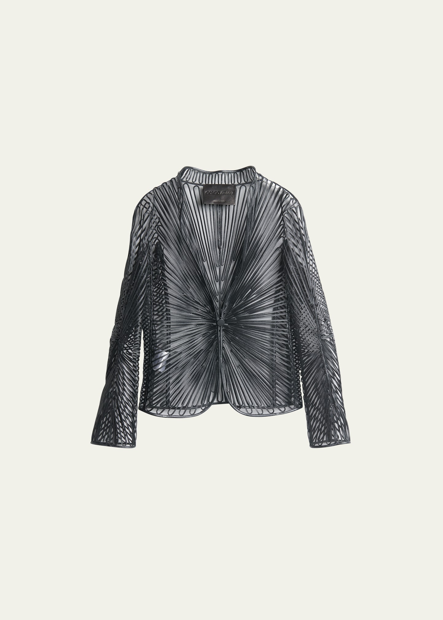 Giorgio Armani "Soutache" jacket in lambskin leather embroidered tulle Strand collar; single-breasted front Long sleeves Slim fit Hook closure Leather/polyester Dry clean Made in Italy