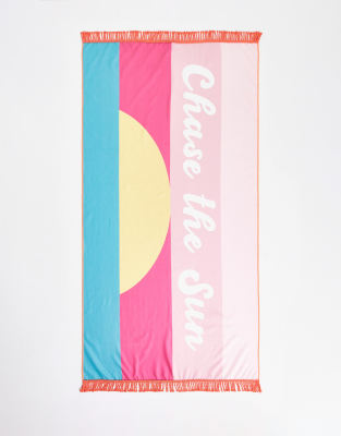 Towels by South Beach Brb, adding to basket Stripe design 'Chase the sun' text print Rectangle cut Tassel ends