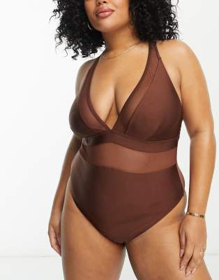 South Beach Curve Exclusive plunge mesh swimsuit in high shine brown