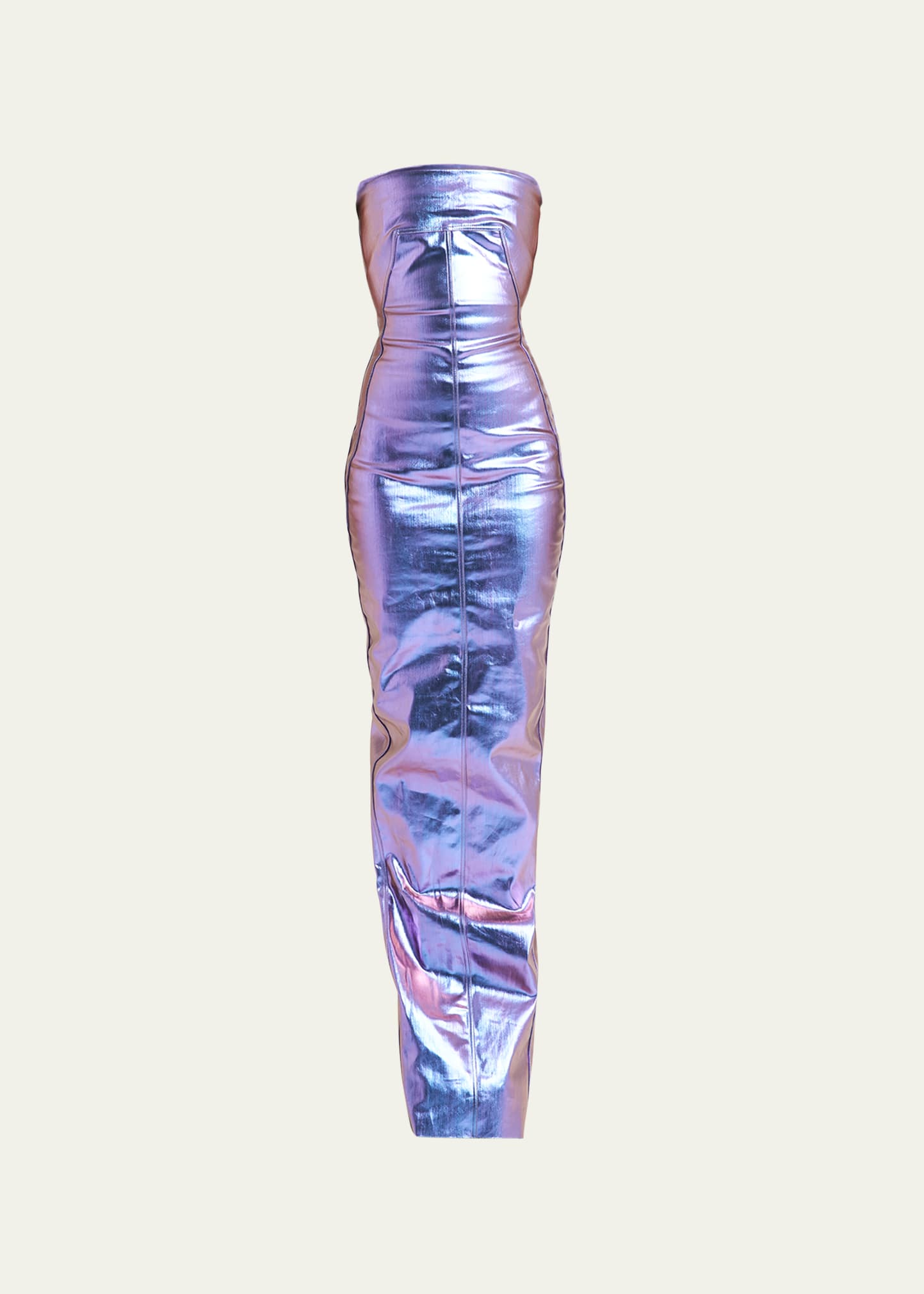 Rick Owens metallic gown Approx. 58"L from shoulder to hem Strapless neckline Sleeveless Column silhouette Full length Back zip Center back slit Cotton/elastane Unlined Professional cleaning recommended Made in Italy