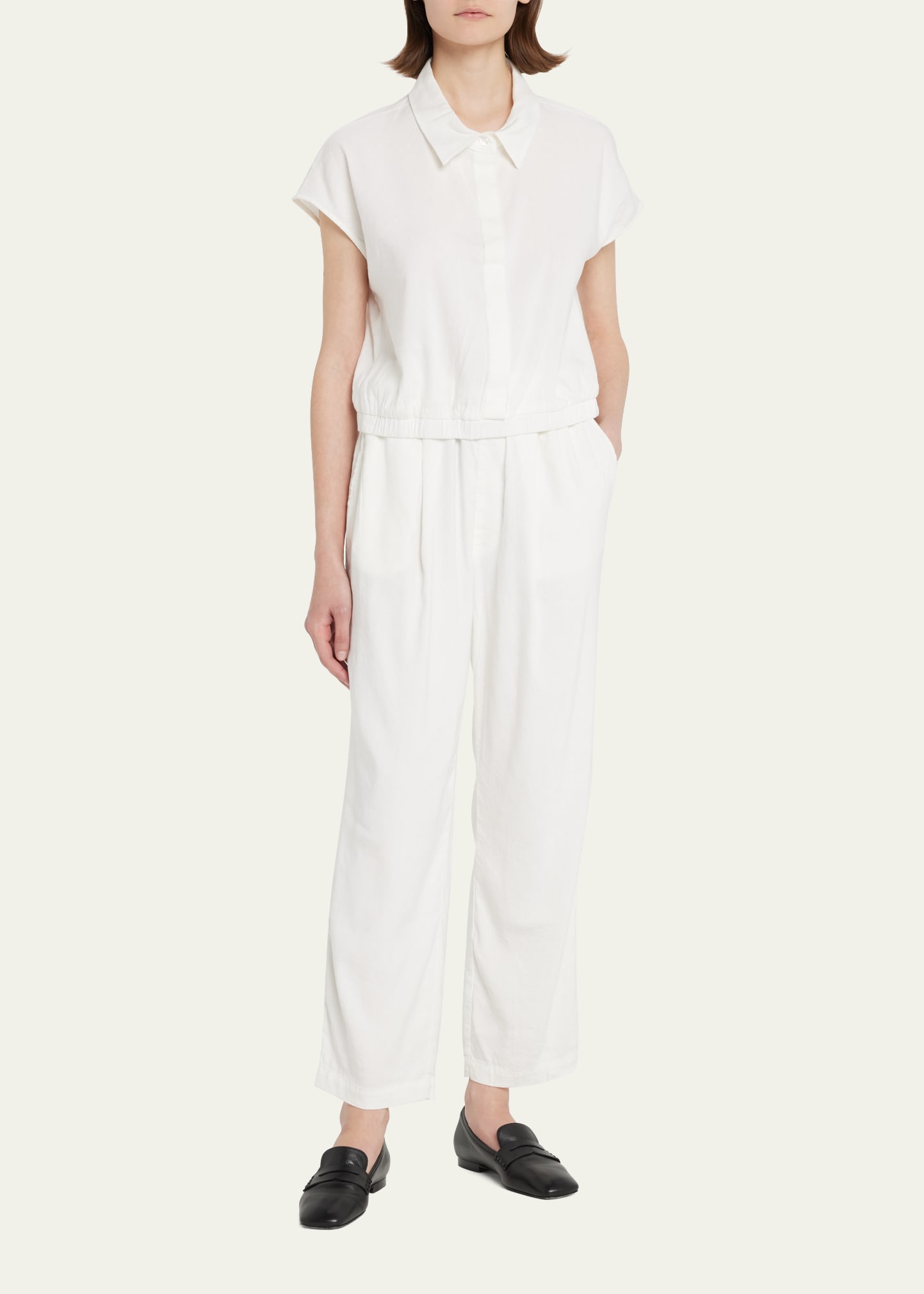 Monrow paperbag pants crafted from a stretched linen fabric High-rise waistband Slanted side pockets Cropped at the ankle Relaxed legs Pull-on style Linen/rayon/spandex Imported