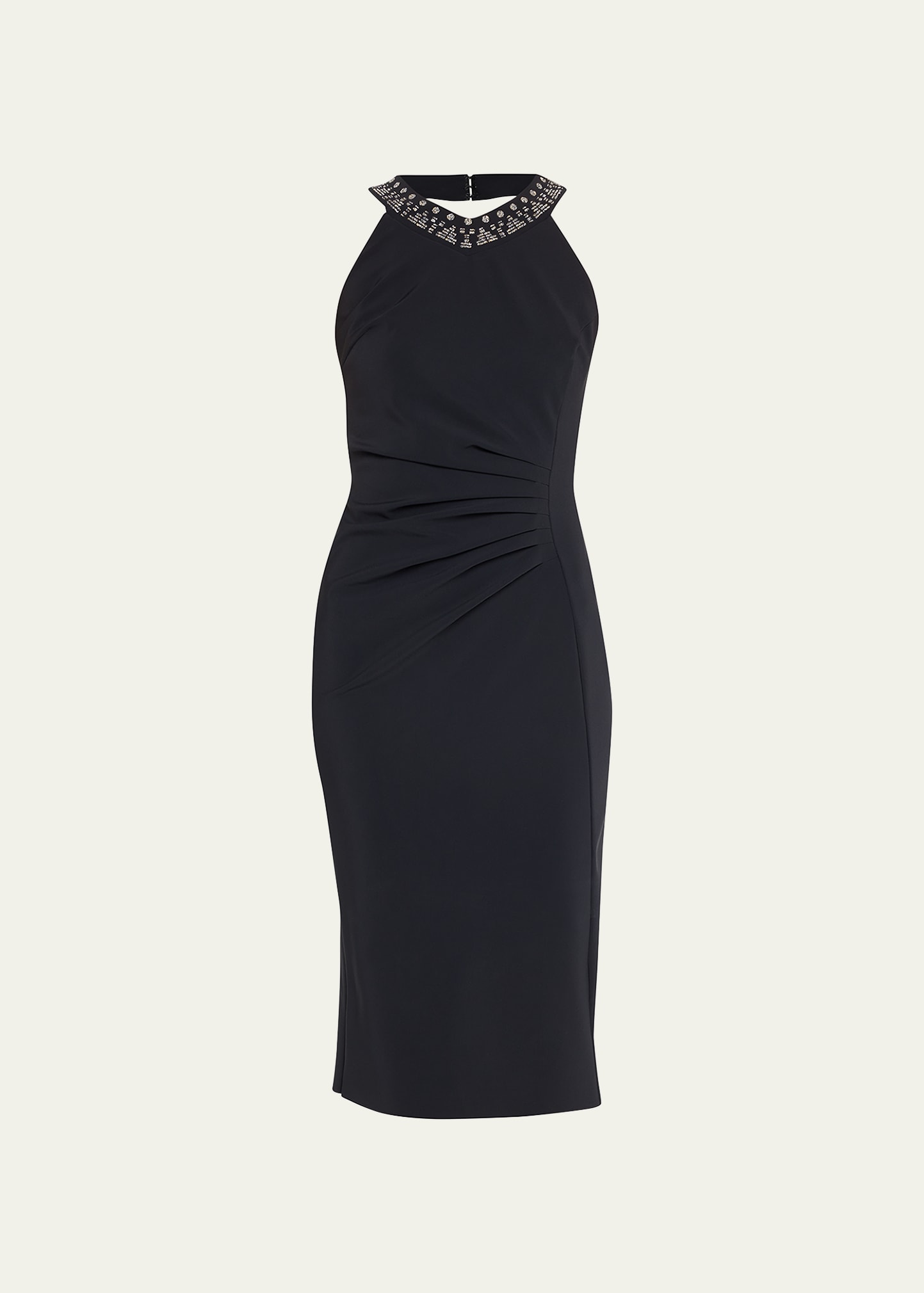 Chiara Boni La Petite Robe "Taolina" ruched midi dress with light-catching beading along the neckline Halter neckline; keyhole hook-and-eye back Sleeveless Raw-edged hem Hem falls below the knee Bodycon silhouette Slipover style Polyamide/elastane Hand wash or dry clean Made in Italy