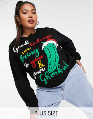 Plus-size sweater by Threadbare Is it even Holidays without a festive sweater? Crew neck 'Gherkin' text to chest Ribbed trim Regular fit