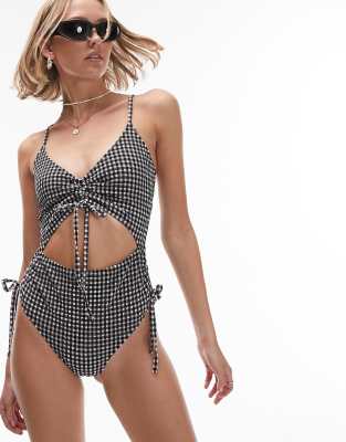 Topshop Petite textured gingham cut out ruched swimsuit in monochrome-Multi
