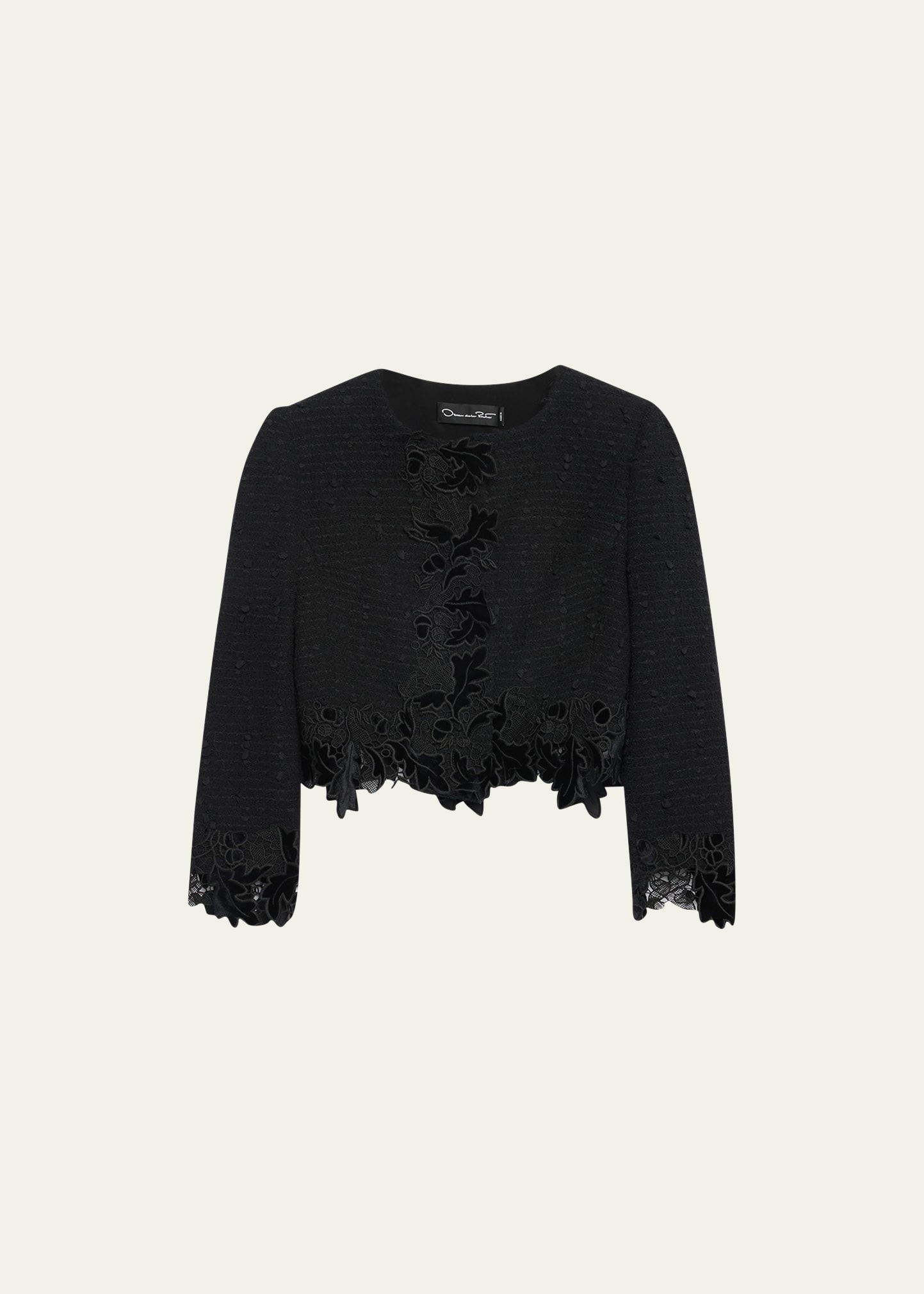 Oscar de la Renta tweed short jacket features floral lace details at the trimming Round collar Concealed front closure Long sleeves Cropped hem Relaxed fit Cotton/polyester Lining: Silk Dry clean Made in Italy