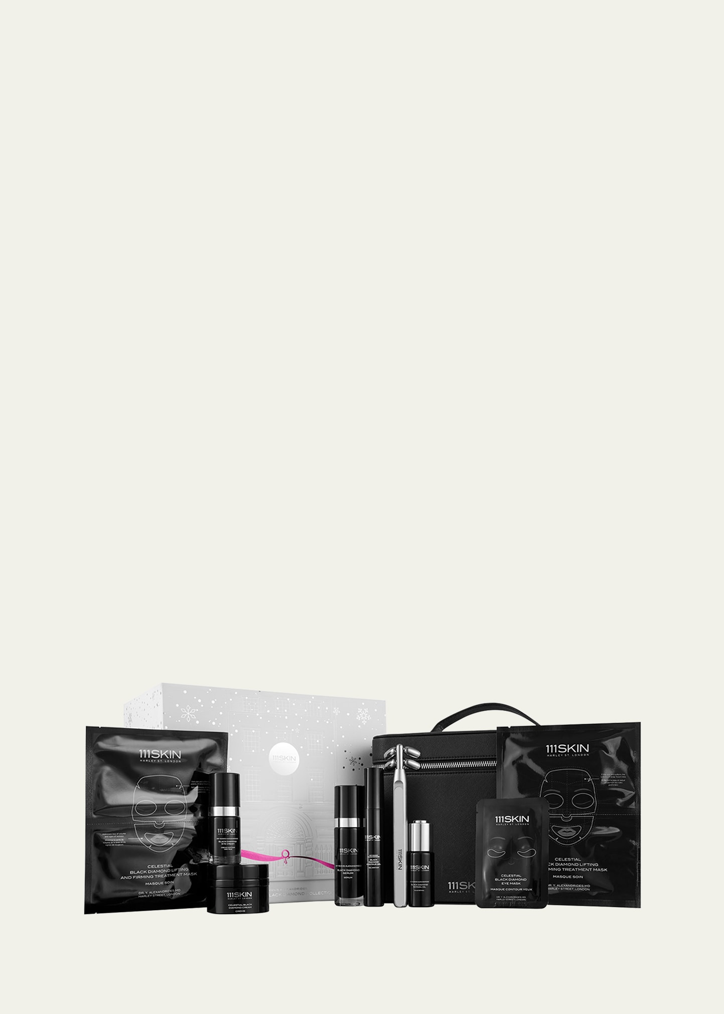 Black Diamond Serum, 30 mL Black Diamond Eye Cream, 15 mL Black Diamond Retinol Oil, 30 mL Black Diamond Contour Gel, 15 mL Black Diamond Cream, 50 mL Celestial Black Diamond Eye Mask 2 x Celestial Black Diamond Lifting & Firming Face Mask 111SKIN Black Diamond Facial Roller Products stored in a luxurious, 111SKIN branded leather travel cosmetic bag What it Does: A combination of powerful skincare actives including 111SKIN's proprietary complex, NAC Y2 designed to repair, soot...