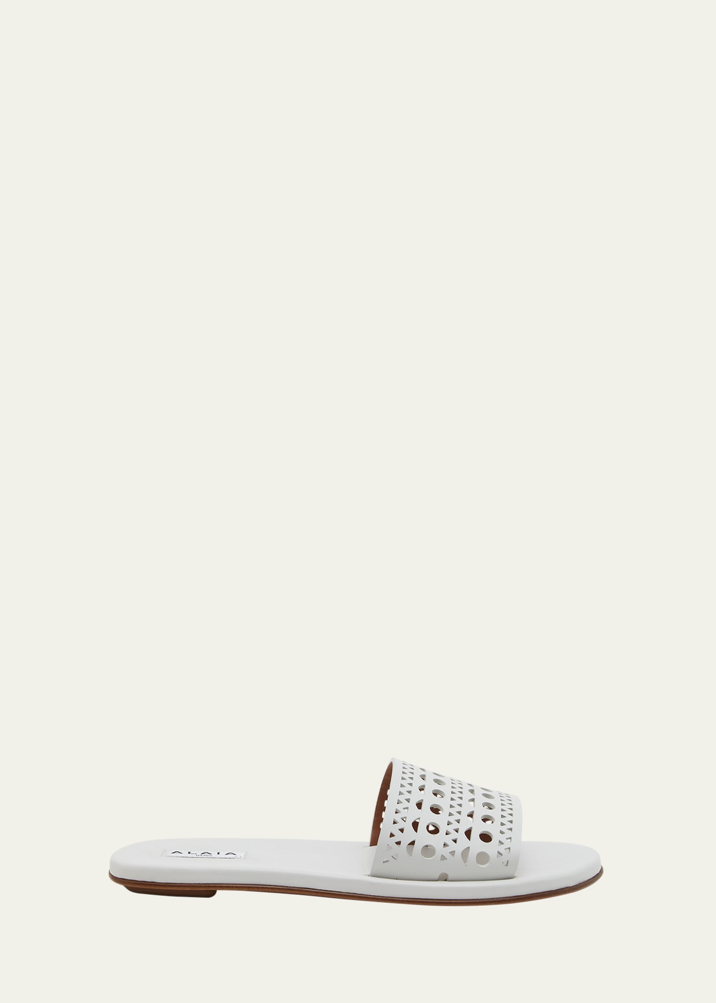 ALAIA "Vienne" laser cut leather sandals 0.17 in / 5 mm flat heel Open toe Wide band upper Slide style Leather/Rubber outsole Lining: Leather Made in Italy