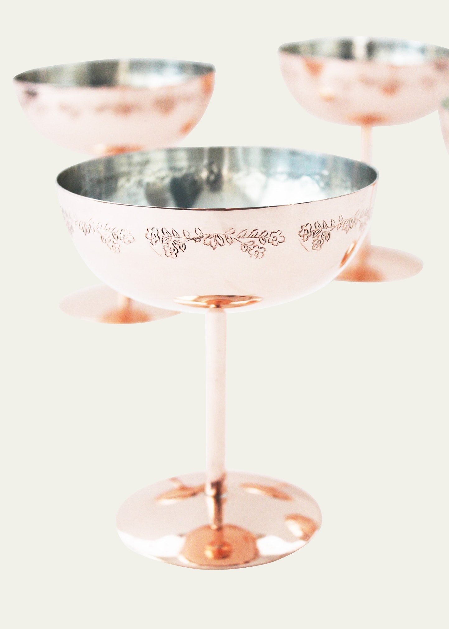 Coupe glasses made of copper lined with tin featuring a hand-stamped floral pattern all the way around Set of two Item Weight (Lbs.): 1.0 Hand wash Imported