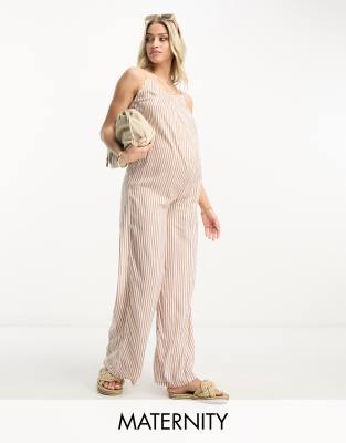 Wednesday's Girl Maternity stripe cami jumpsuit in rust-Brown