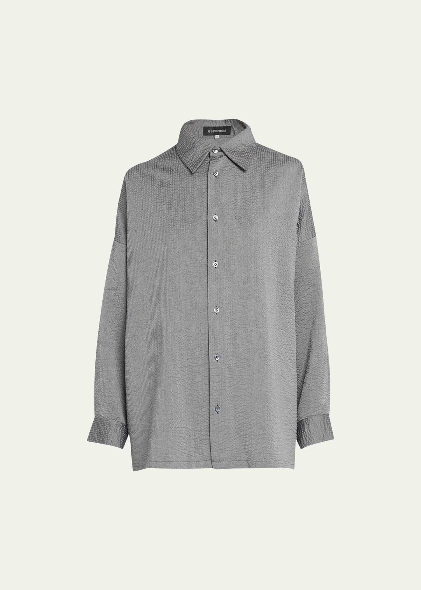 Eskandar wide a-line shirt with collar (long) Spread collar Button-sewn front Long sleeves; button cuffs Mid-length Relaxed fit Cotton Made in Poland