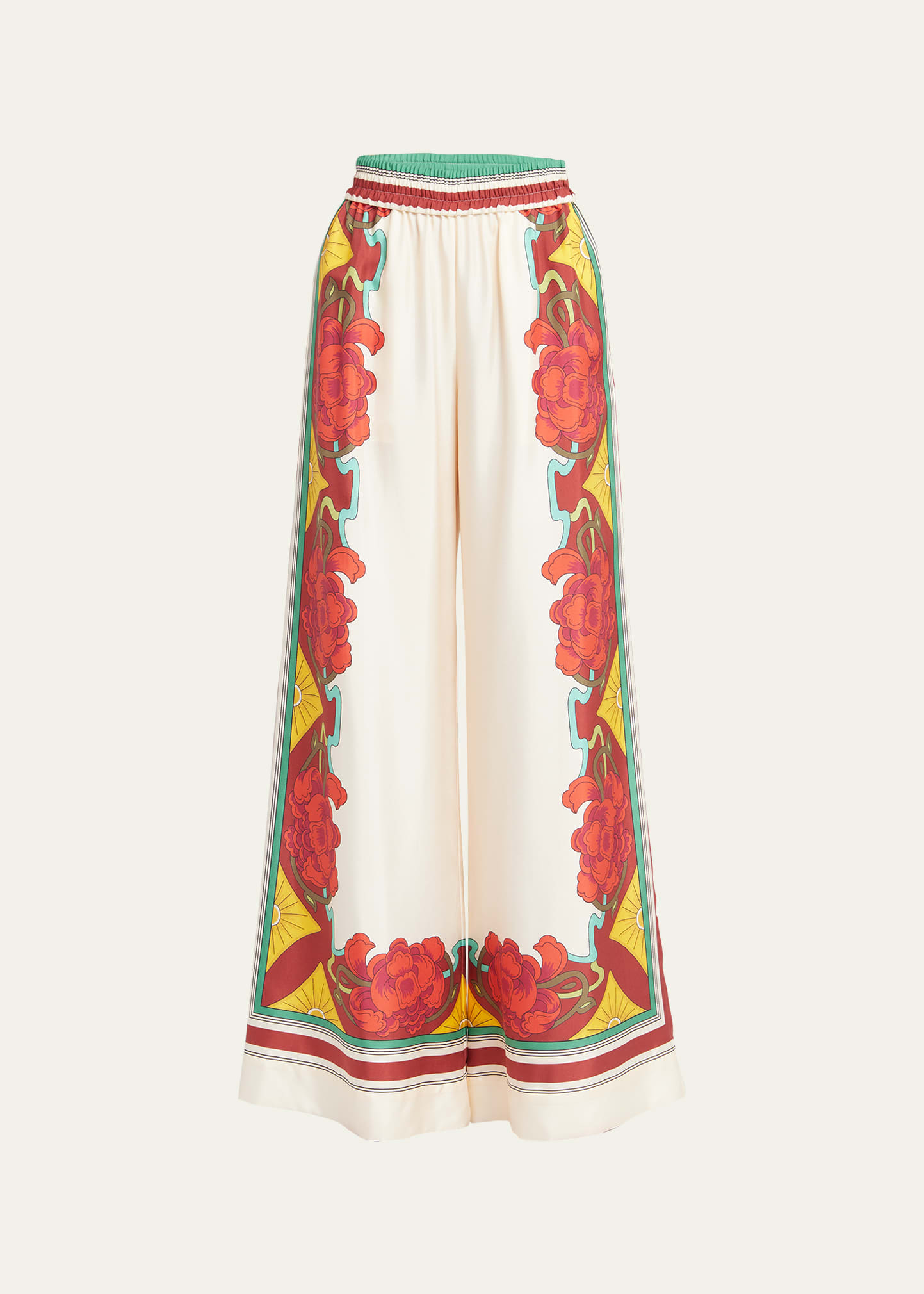 La DoubleJ palazzo pants featuring printed floral details at the sides Mid-rise; sits high on hip Elastic waistband Side slip pockets Wide legs Full length Relaxed fit Silk Unlined Dry clean Made in Italy