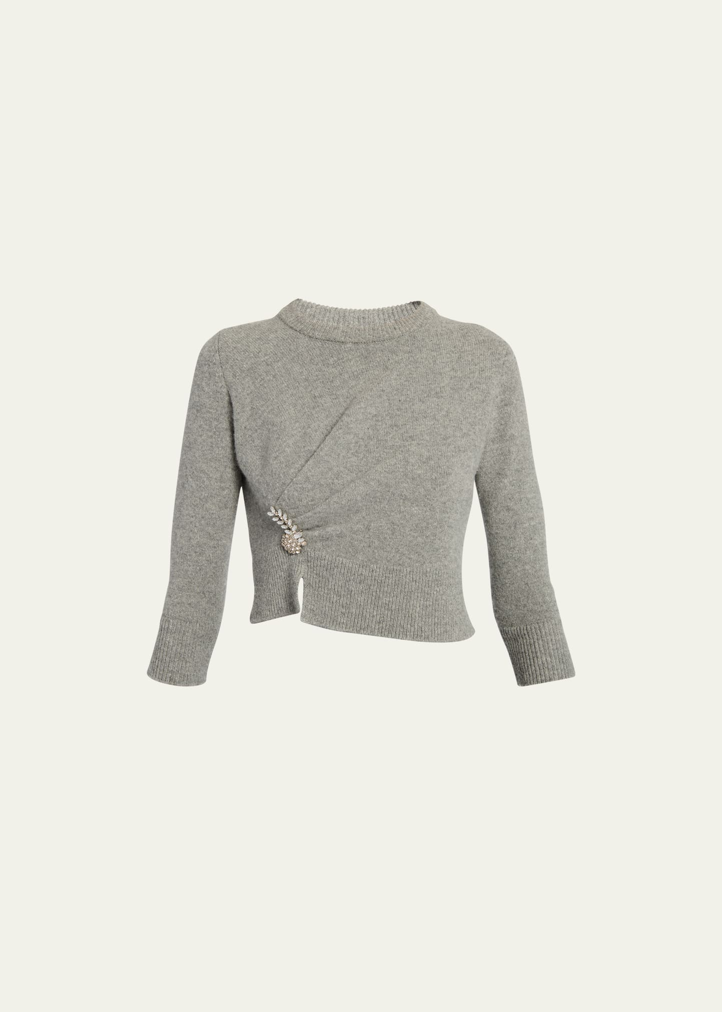 Erdem knit jumper made from virgin wool featuring a crystal embellished draped front detail Crew neckline 3/4 sleeves Ribbed trim Cropped hem Semi-fitted Pullover style Virgin wool Dry clean, professional cleaning recommended Made in Romania