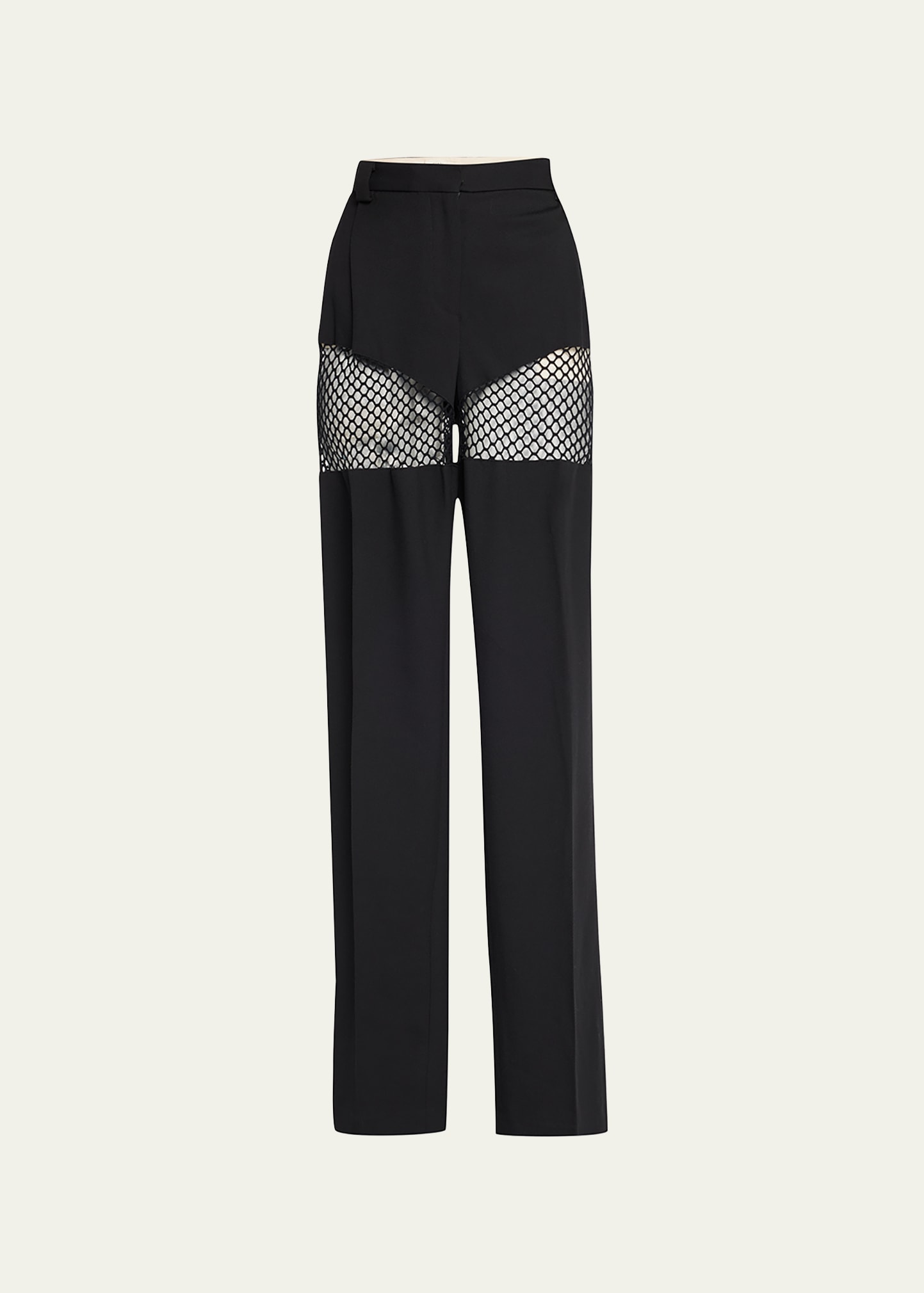 DIOTIMA tailoring pants with net insert at thigh High rise Flat front Back welt pockets Straight legs Full length Tab/zip fly; belt loops Wool/viscose/cotton Dry clean Made in USA