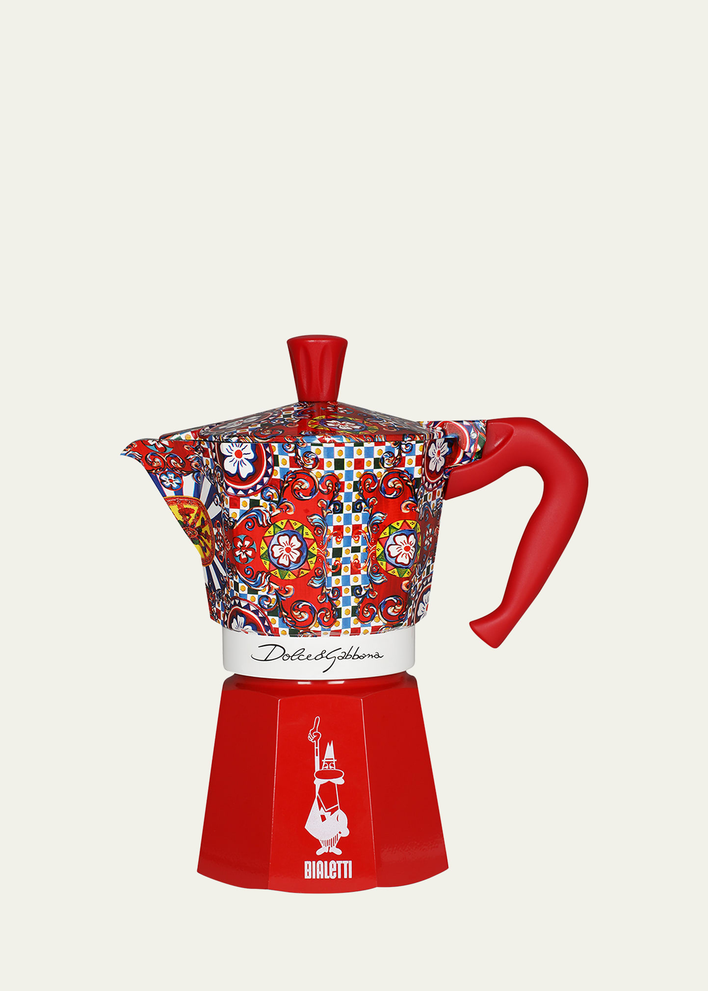 Moka Express by Bialetti x Dolce & Gabbana evokes, in its decorative motif inspired by an archival foulard print, the Carretto Siciliano: a folkloric element from a place of traditions that have always been at the heart of Dolce & Gabbana's aesthetics. Easy-clean safety valve Makes up to six cups of coffee Body, aluminum Handle and knob, thermoplastic Boiler capacity, 10.2 oz. Approx. 7.25"L x 4.1"W x 9.1"T Suitable for use on gas, electric, and glass ceramic hobs Do not use on.