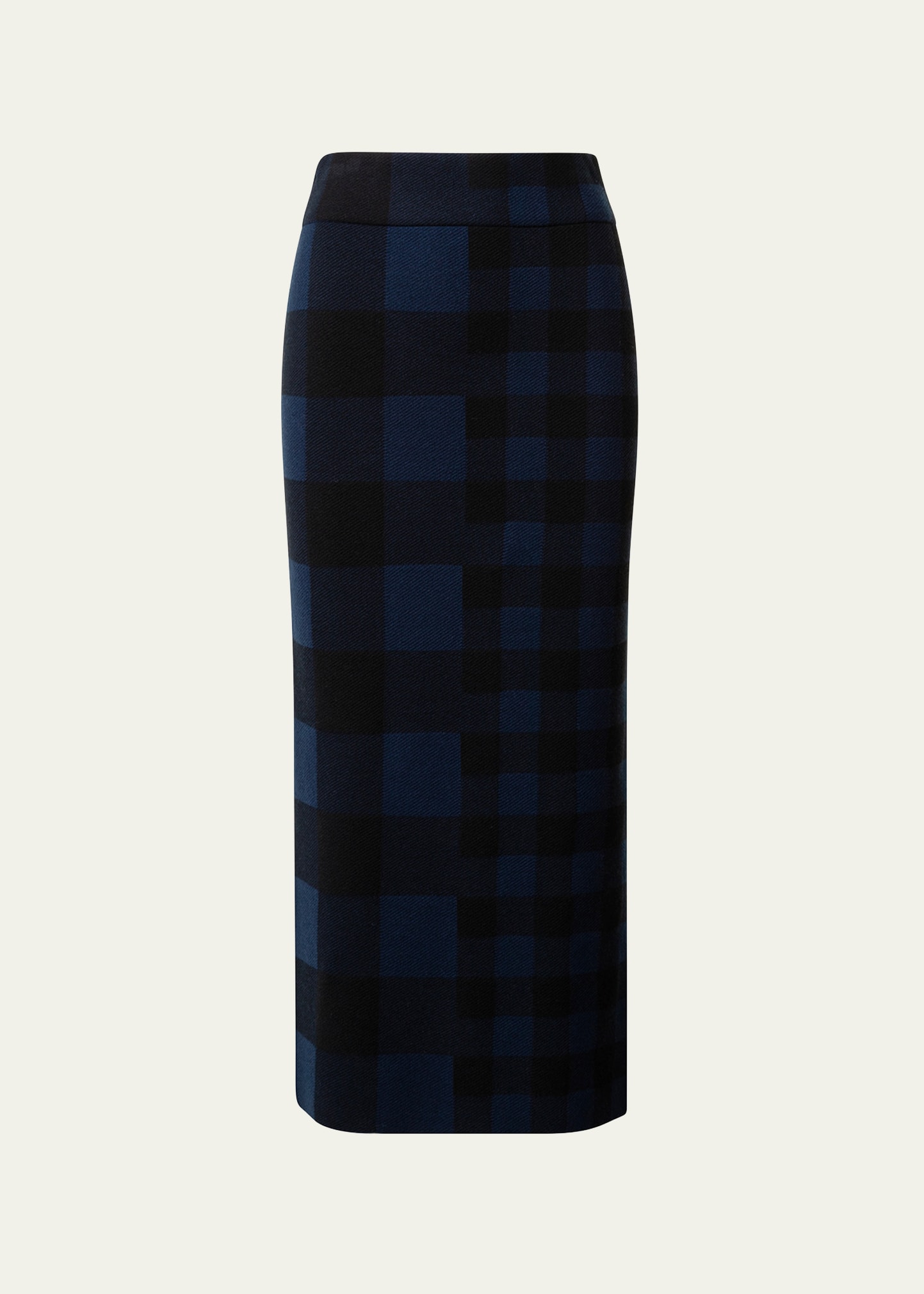 Akris punto tube midi skirt in merino wool features an allover XL gingham jacquard knit finish High rise; elastic waistband Side slits Hem falls below the knee Skirt falls straight from hip to hem Virgin wool/elastane Imported